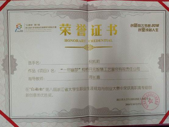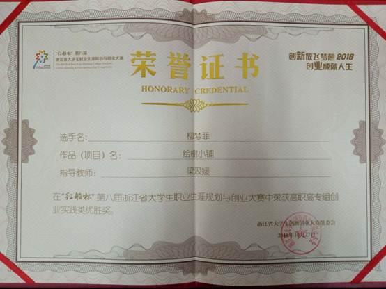 近日,2016年“红船杯” 第八届浙江省大学生职业生涯规划与创业大赛获奖名单公布,台湾三级片 3位同学在此次大赛中获得优异成绩。其中,由周明宝老师指导的、尤妮斯参赛的《助梦财务——不只是你的财务管家》获创业实践类优胜奖;由梁汲媛老师指导的、柳梦菲参赛的《绘樹小铺》获高职高专组创业实践类优胜奖;由周长喜老师指导的、倪凯莉参赛的《“一帘幽梦”柯桥开元智慧工艺窗帘有限责任公司》获高职高专组创新创意类优胜奖。