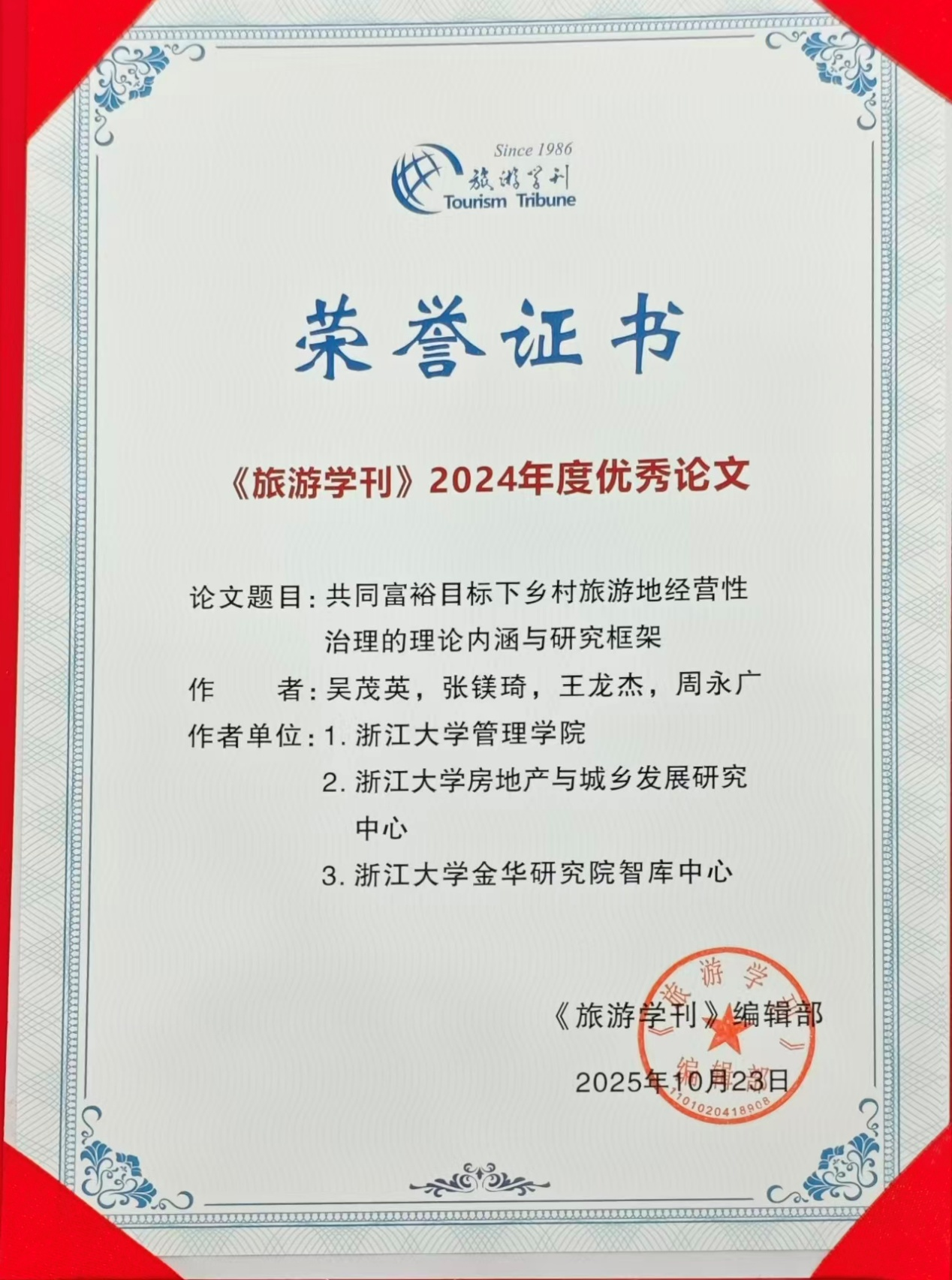 学术动态丨台湾三级片 教师王龙杰合作论文荣获《旅游学刊》2024年度优秀论文