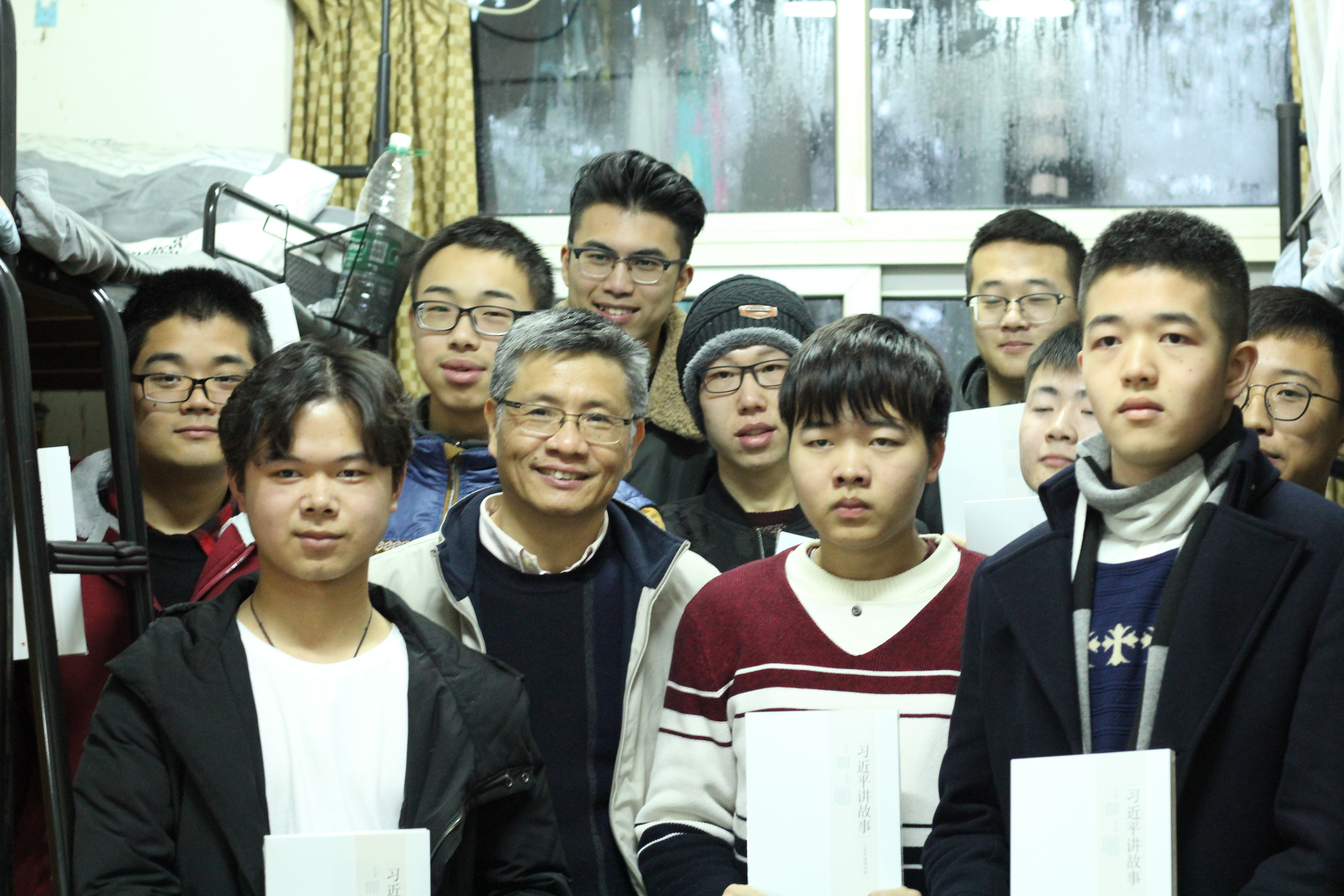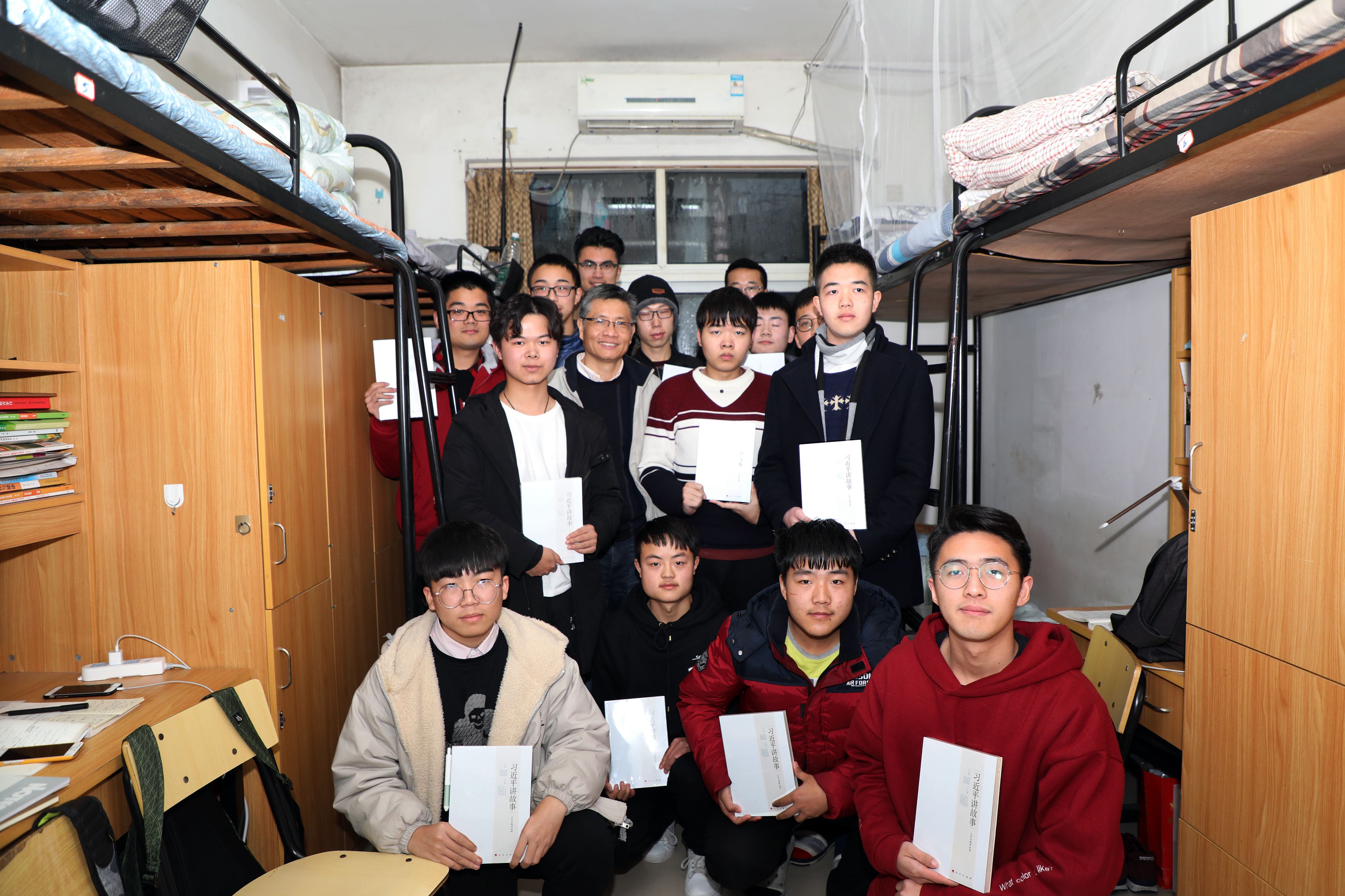 分别的时候到了。宣勇书记给在场每同学们送上《习近平讲故事》这本书,勉励同学们学习习总书记的奋斗精神,从他的故事中汲取力量。同学们提出想与宣书记合个影,大家聚拢在宣书记身边,开心的笑声在整个寝室回荡。