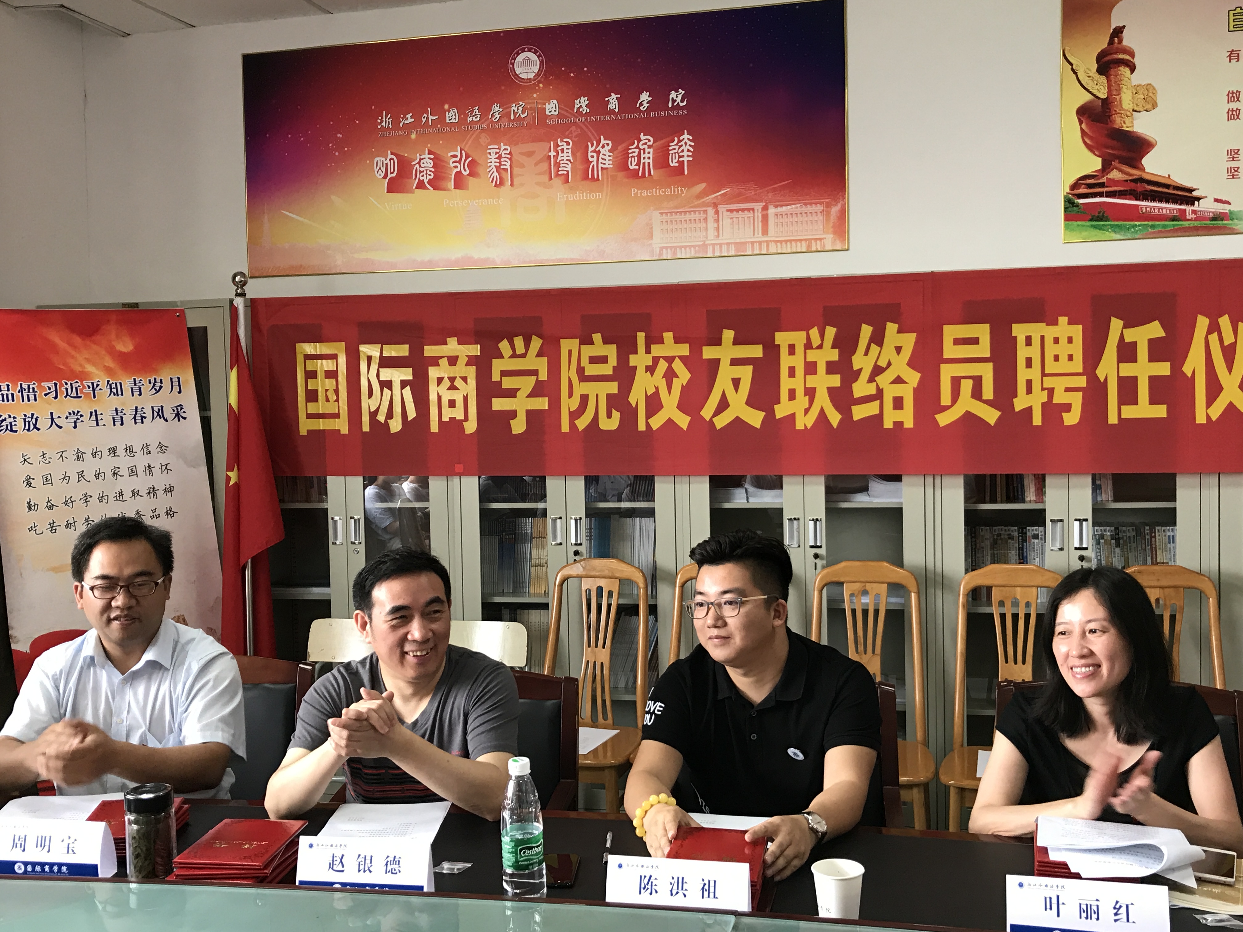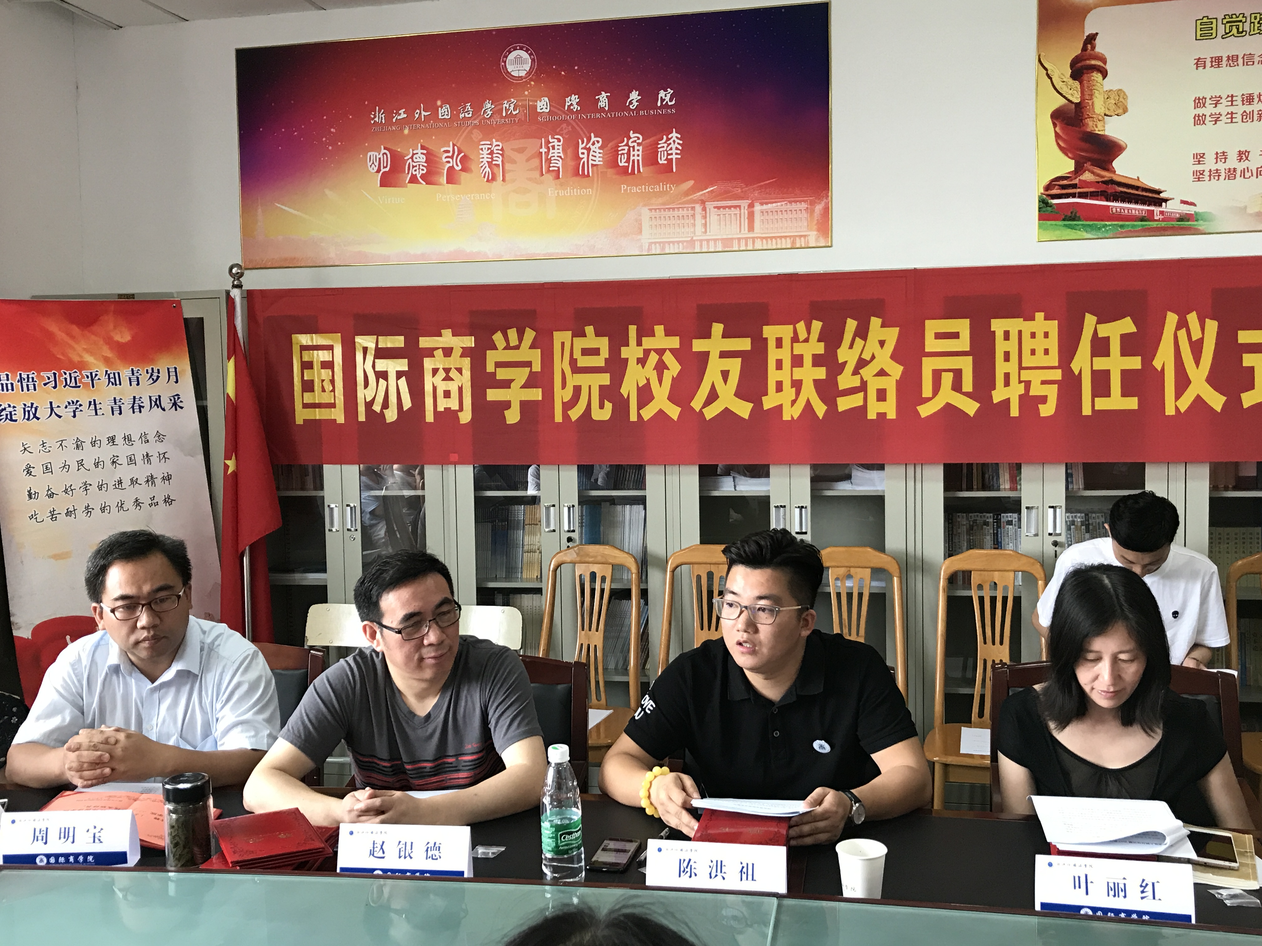 在悠扬的校歌声中,陈洪祖和学院领导向校友联络员颁发聘书。校友代表陈明灿、贺丹媛、章优优、黄涛、任玮、张志坚代表各专业依次发表感言。
