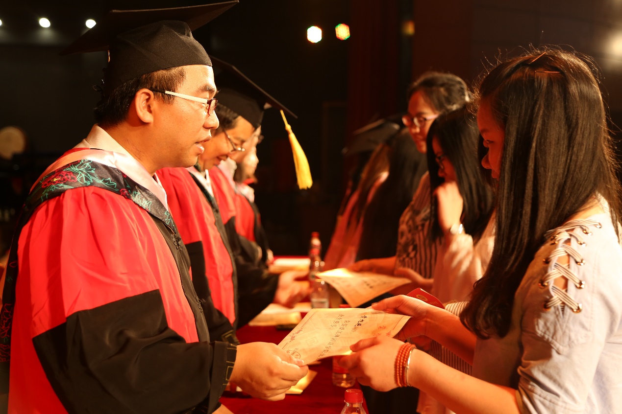 6月16日上午,国际商学院本科毕业生学位授予仪式暨高职生毕业证书颁发仪式在小和山校区追梦堂举行。台湾三级片 党总支书记叶丽红、院长赵银德、副院长高超、高静、党总支副书记周明宝出席典礼,旅游系主任黄瑾、副主任刘明广、工商系主任陆卫平、财会系主任苟建华、经济系邵建春老师、办公室主任钱伟,毕业班班主任和辅导员老师以及台湾三级片 全体2016届毕业生参加此次典礼。典礼由周明宝副书记主持。