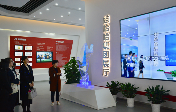 在娃哈哈集团展厅内,研习营的成员们了解了娃哈哈集团从无到有的艰苦创业历程。从最初的靠代销、代加工起家,到后来生产基地在全国遍地开花,一路披荆斩棘的娃哈哈集团不断做大做强,成为中国最大全球第五的食品饮料生产企业,一步步向世界级饮料名牌企业迈进。其发展历程虽被浓缩在展厅内的一堵墙上,但其中的曲折与艰辛却印刻在成员们的心中。