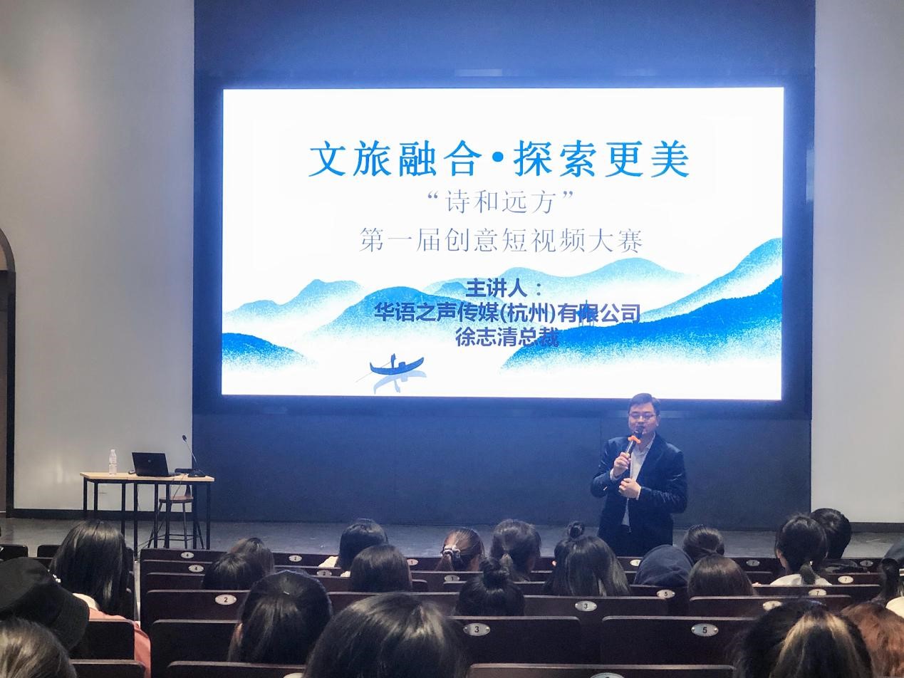 学院邀请到华语之声传媒(杭州)有限公司的徐志清总裁莅临现场,徐总结合企业经营案例,为同学生动地讲解了短视频创作原则以及在短视频传播中的注意事项,特别强调了短视频创作中的肖像、音乐、素材的版权问题。