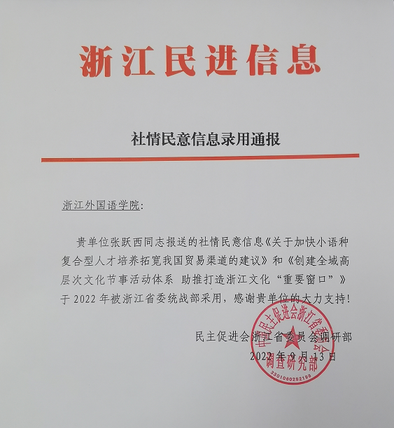近日,我校文旅学院会展传播系教授张跃西撰写的题为《关于加快小语种复合型人才培养拓宽我国贸易渠道的建议》和《创建全域高层次文化节事活动体系 助推打造浙江文化“重要窗口”》等两篇社情民意信息被浙江省委统战部采用。