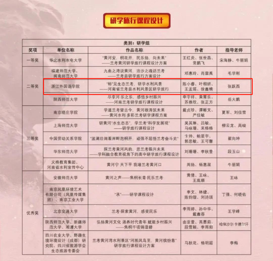 我校“重要窗口”研究所所长、文旅学院会展传播系教授张跃西指导的《“裕”见生态兰考,研学水利风景——河南兰考研学旅行课程设计》获得大赛研学组二等奖。