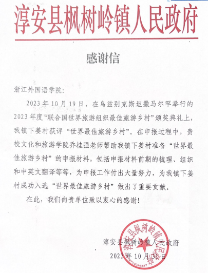 10月19日,在乌兹别克斯坦撒马尔罕举行的2023年度“联合国世界旅游组织最佳旅游乡村”颁奖典礼上,我省淳安县下姜村获评“世界最佳旅游乡村”。淳安县枫树岭镇人民政府发来感谢信,对我校文旅学院国际文旅系乔桂强老师在申报过程中提供的帮助与指导表示感谢。