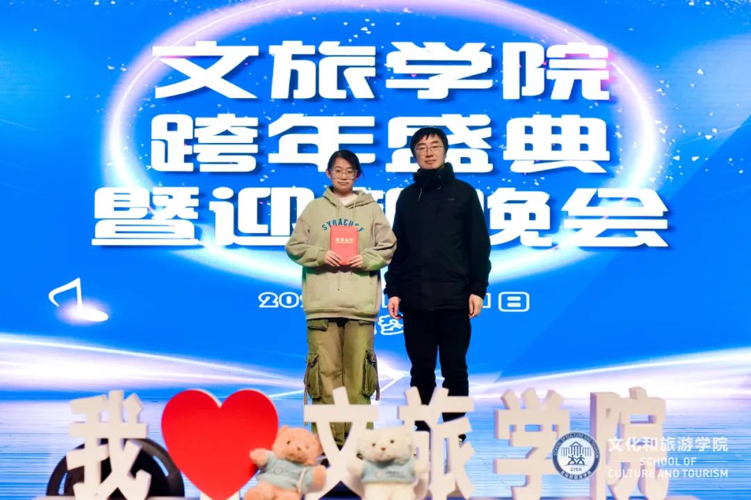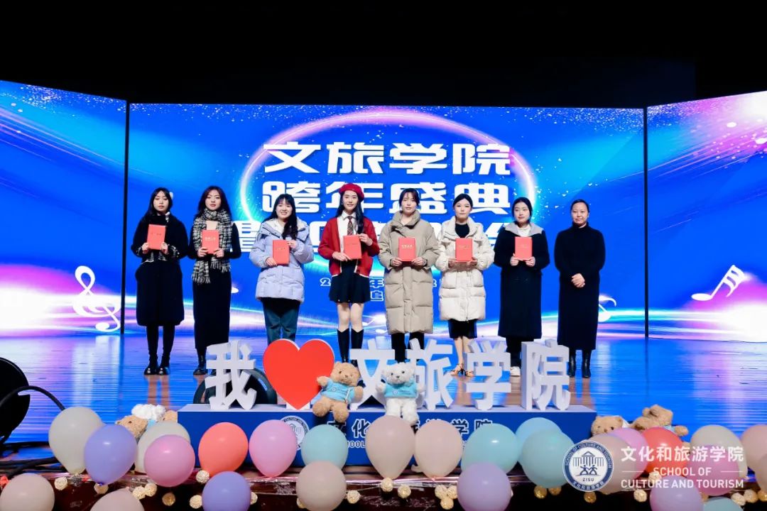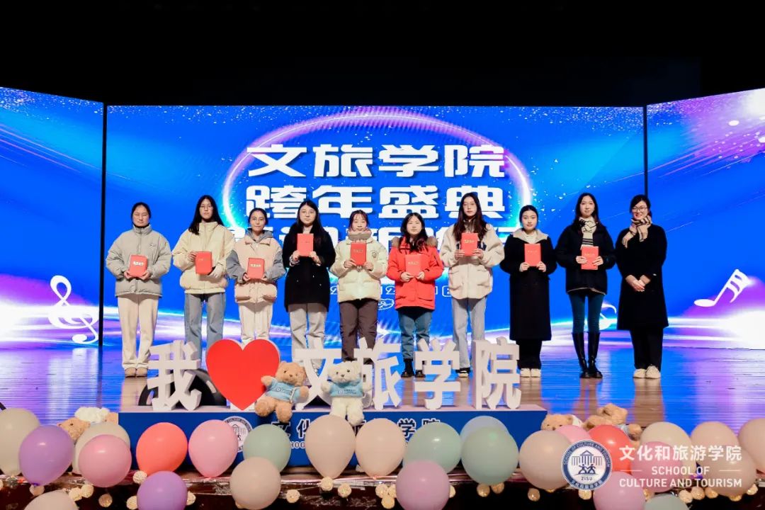 学工部部长屠立达、团委书记邱萍、学院院长张健康、党总支书记范芸芸、党总支副书记陈超、院长助理王敏娴为荣获国家奖学金、省政府奖学金和获评“文旅之星”等荣誉称号的学生及团队颁奖。