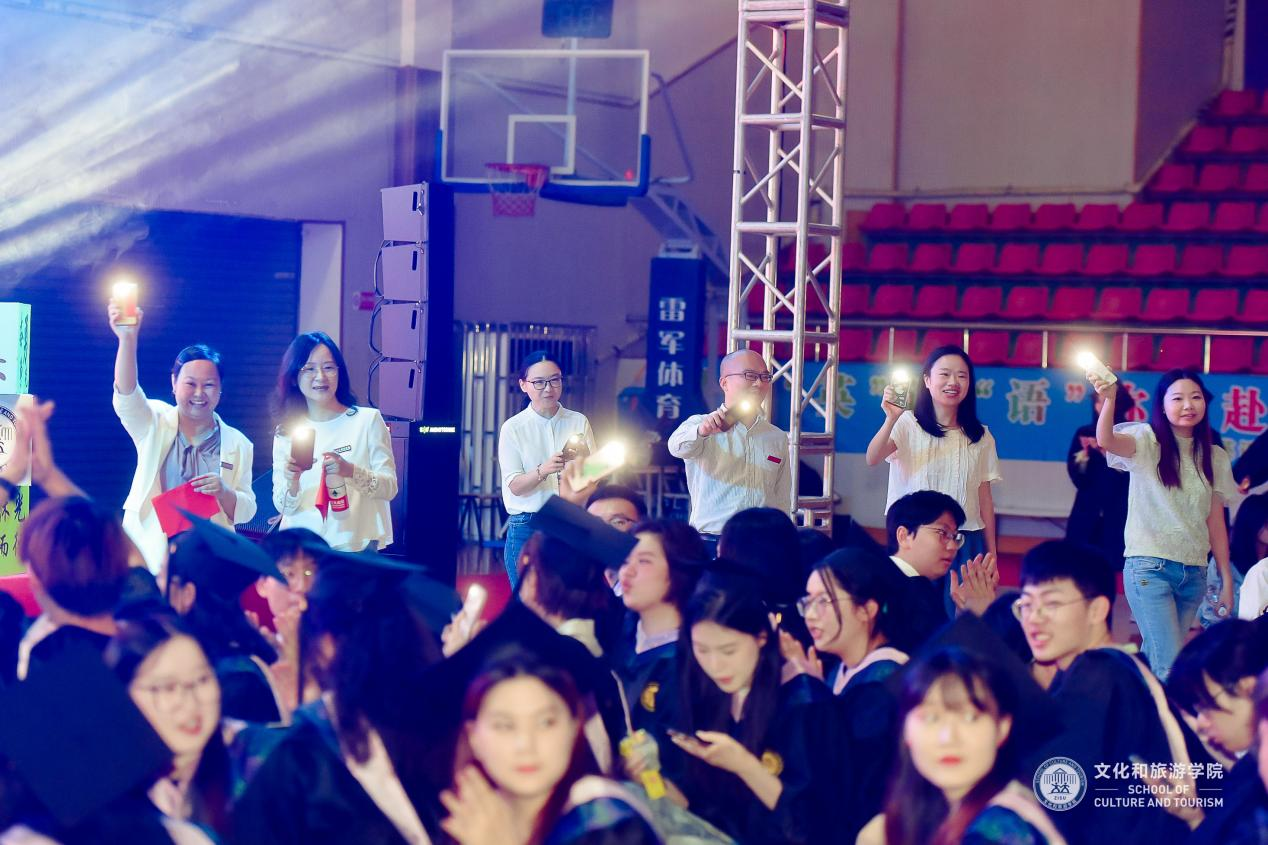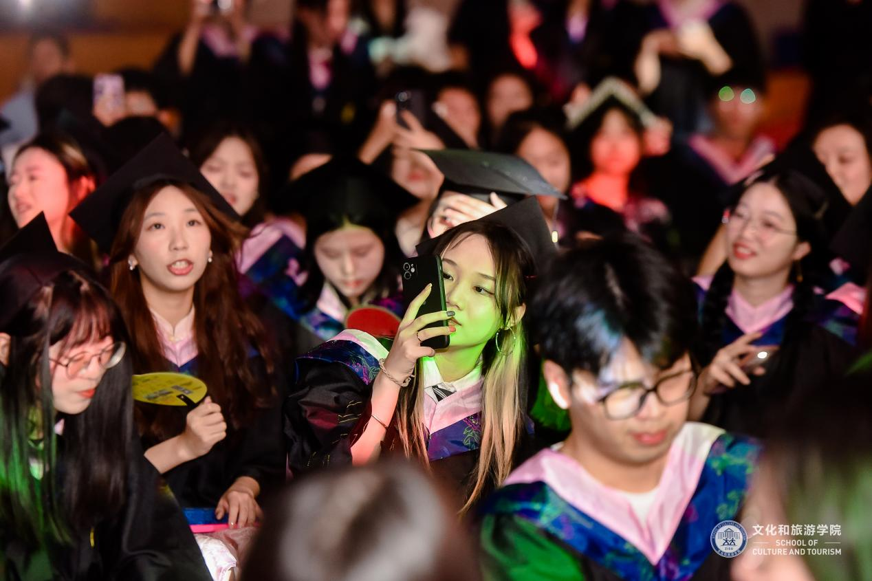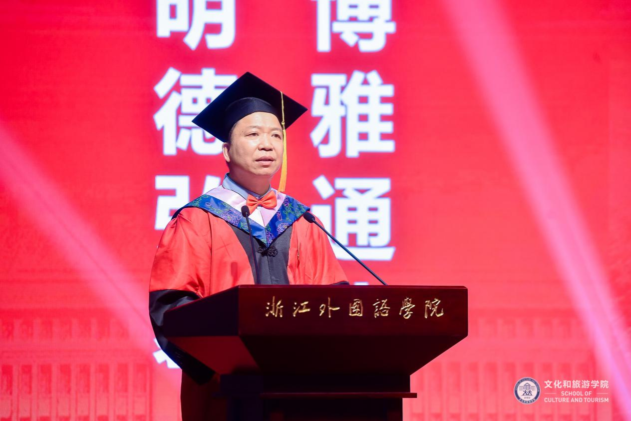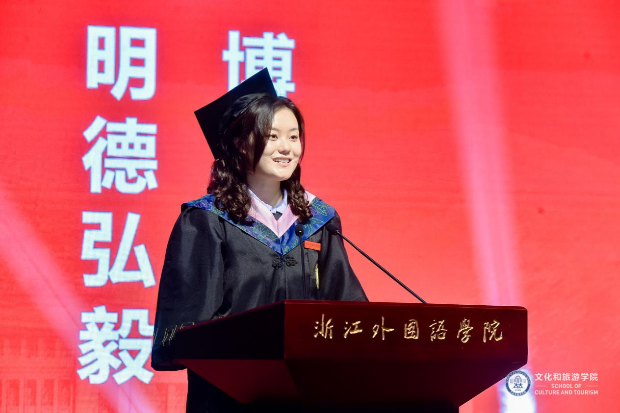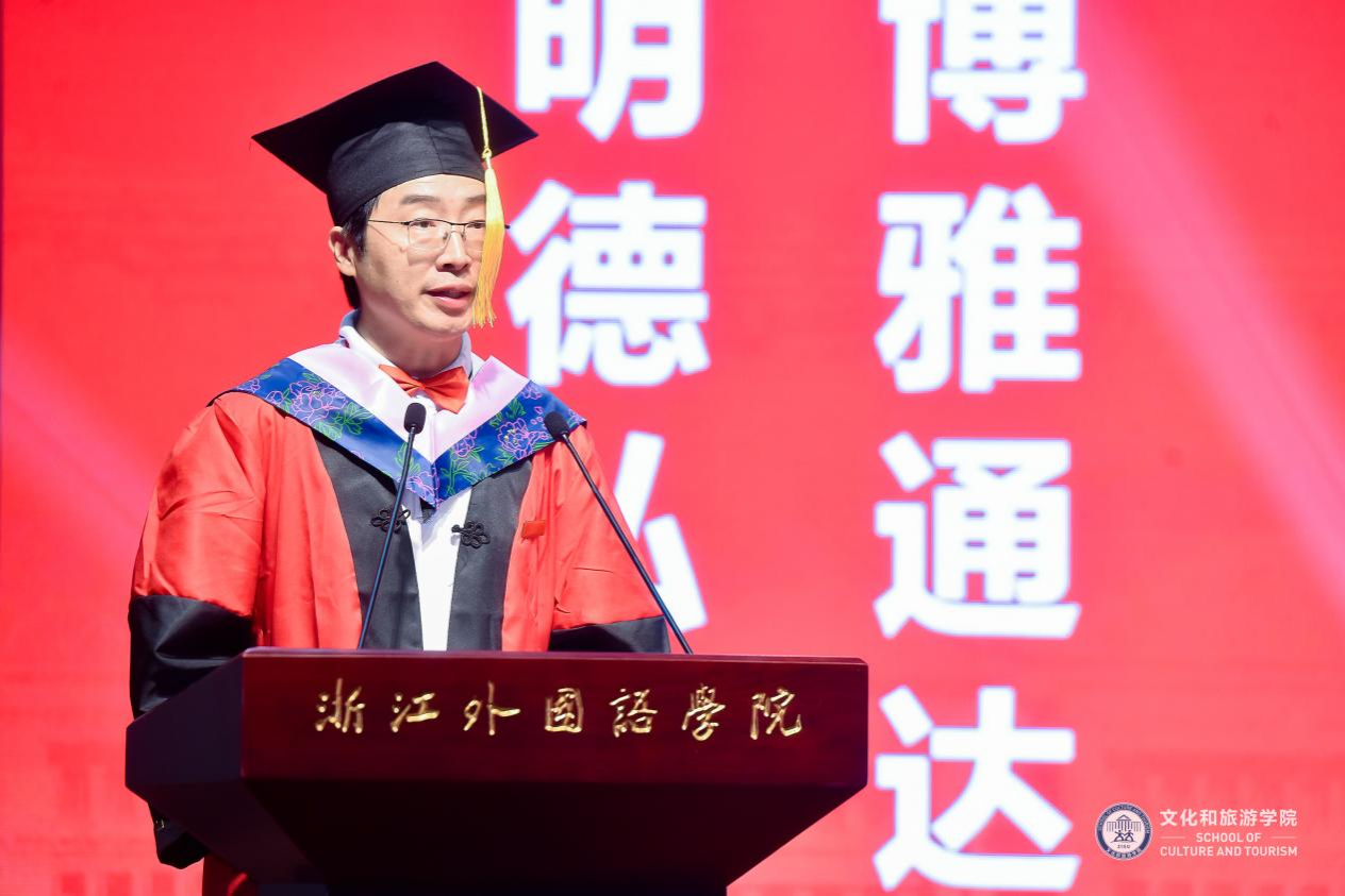 毕业生代表苏航和教师代表沈旭炜先后发言。苏航同学代表全体毕业生,深情表达了对母校、对老师、对同学的真挚感谢与美好祝愿,她表示,作为文旅学子,有幸见证了文旅学院的成立、完成联合国世界旅游组织旅游教育质量认证、再到近期与北大的合作共建。大家作为文旅学子,将不会困阻于眼前的大山,未来会在天地间,遇见更好的自己。毕业班班主任沈旭炜老师以院训“博学笃行,无远弗届”为引,嘱咐每位文旅毕业生带着“我本是高山”的信念,用文化的智慧和旅游的热情,书写人生的精彩篇章。