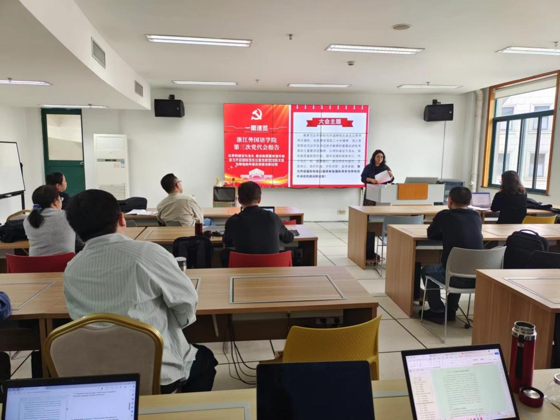 会上,学院党总支副书记、党代表黄瑾以详细的图解,为教职工传达了学校第三次党代会精神,对大会主题、过去五年十个方面的工作成就、三方面至深体会、六个规律性认识,学校的新使命新定位及中远期愿景、锻造浙外能力及六个显著提升、三大发展战略、八个“新”的五年建设任务、党的建设任务等进行了深入解读。