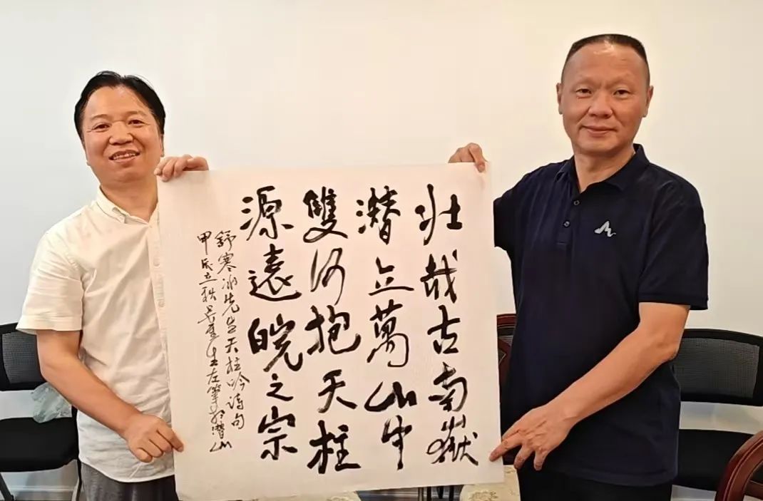 图为应潜山市委常委、天柱山管委会副主任舒寒冰(右)之嘱左书其诗作——“壮哉古南岳,潜立万山中;双河抱天柱,源远皖之东”。