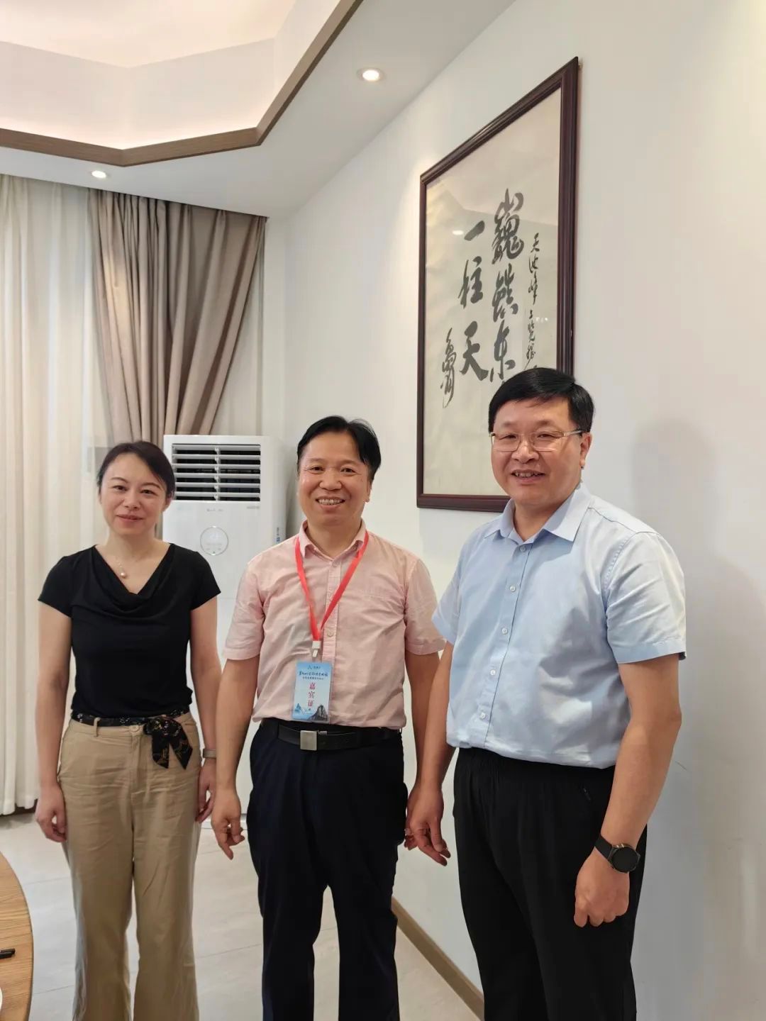 当天,应潜山市委常委、天柱山管委会副主任舒寒冰之嘱,吴重生左书其诗作——“壮哉古南岳,潜立万山中;双河抱天柱,源远皖之东”,并作国画《芭蕉君子图》赠予天柱山管委会。随后,吴重生与天柱山管委会所属潜山天柱山研学旅行有限公司负责人就校地合作事宜进行洽谈,并达成了共识。