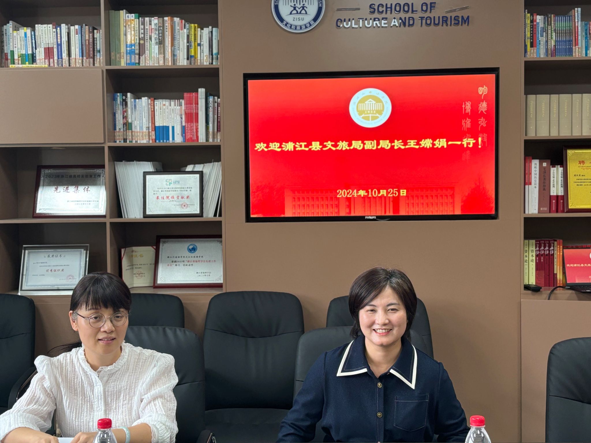 10月25日,浦江县文旅局副局长王嫦娟一行来院调研,洽谈合作事宜。文旅学院学术院长吴重生出席座谈交流,办公室联络员郝韵参加座谈。
