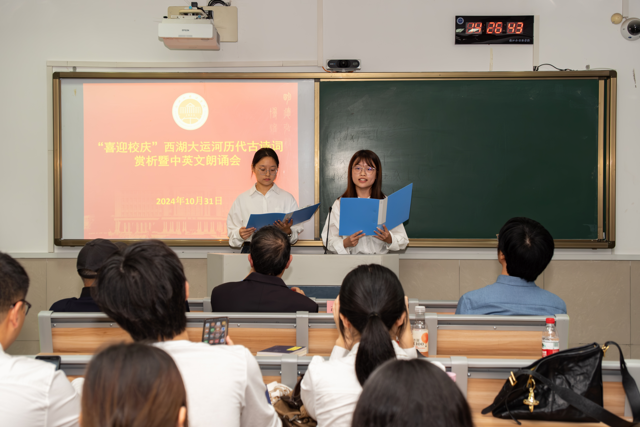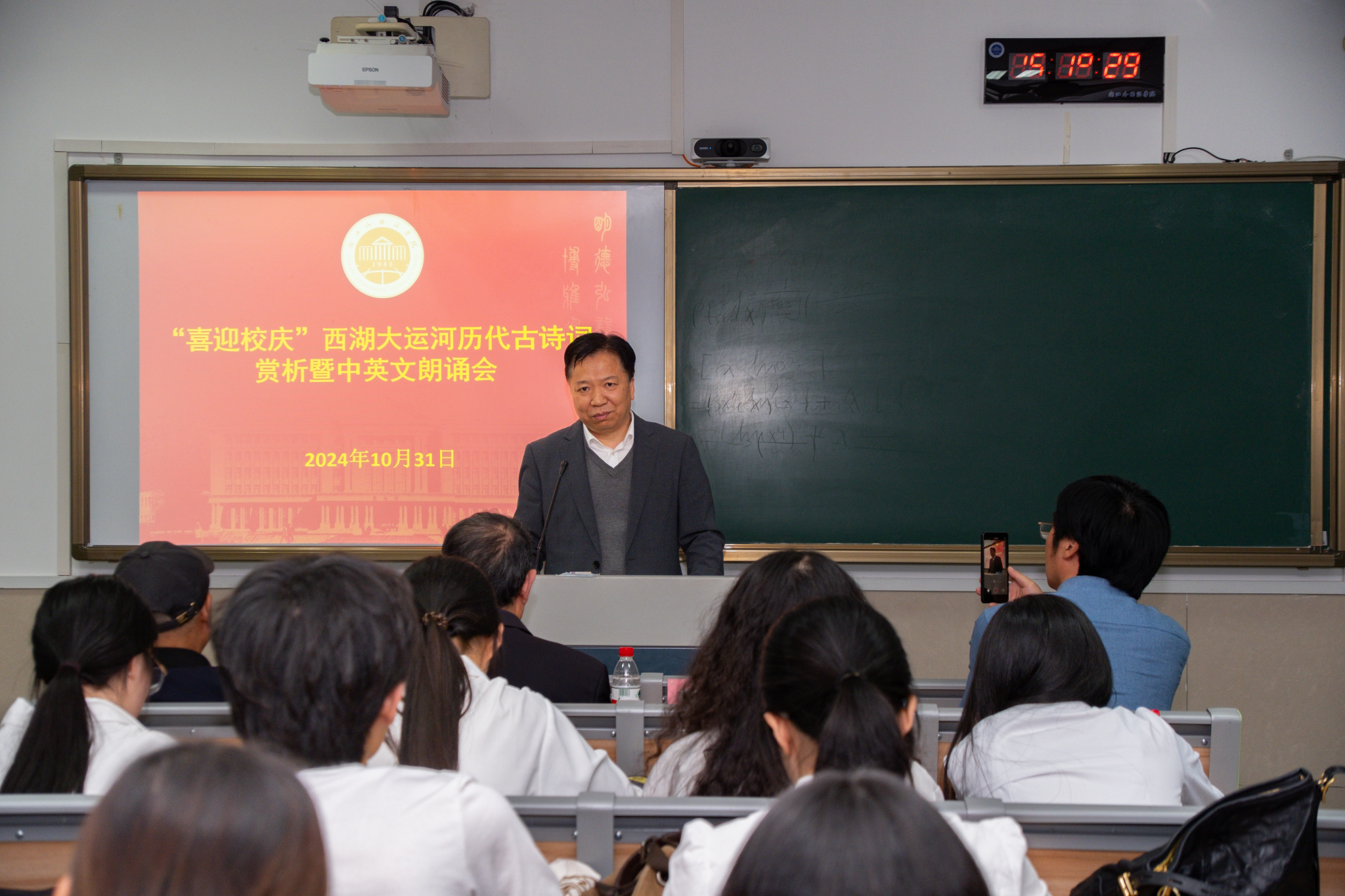 “喜迎校庆”西湖大运河历代古诗词赏析暨中英文朗诵会10月31日下午在望D411举行。本次活动由文旅、中文、英文三个学院联合举办,百余名师生参加。校长张环宙教授到会致辞并向学生代表赠送“中华国学经典精粹”丛书。