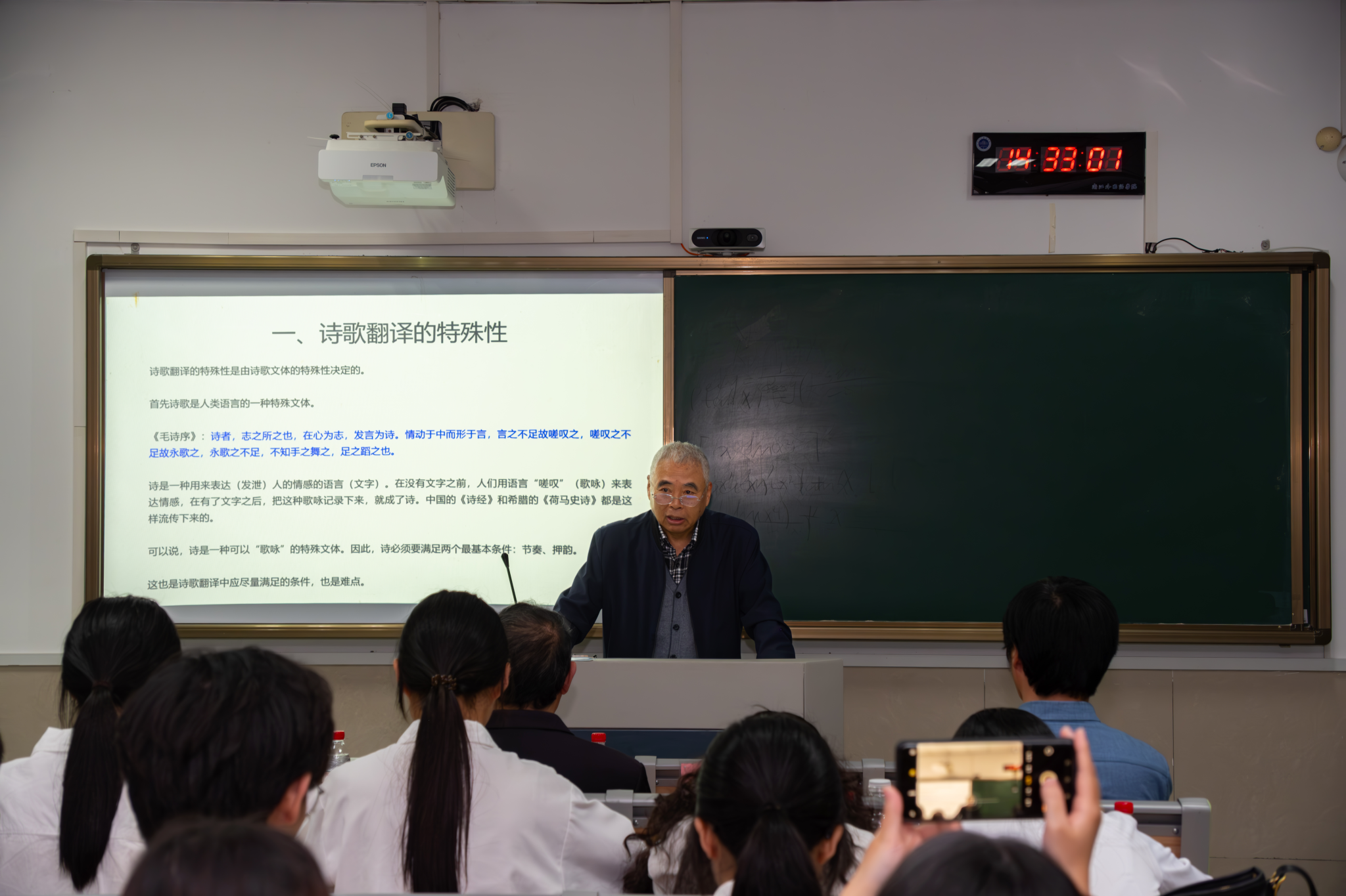 原英文专业柏舟教授讲授《汉诗英译中的几个问题及其解决方法》,深入讲解诗歌翻译的特殊性、融“意”于“象”的意象转换、汉诗英译中的典故和押韵等,学术性和趣味性并茂。
