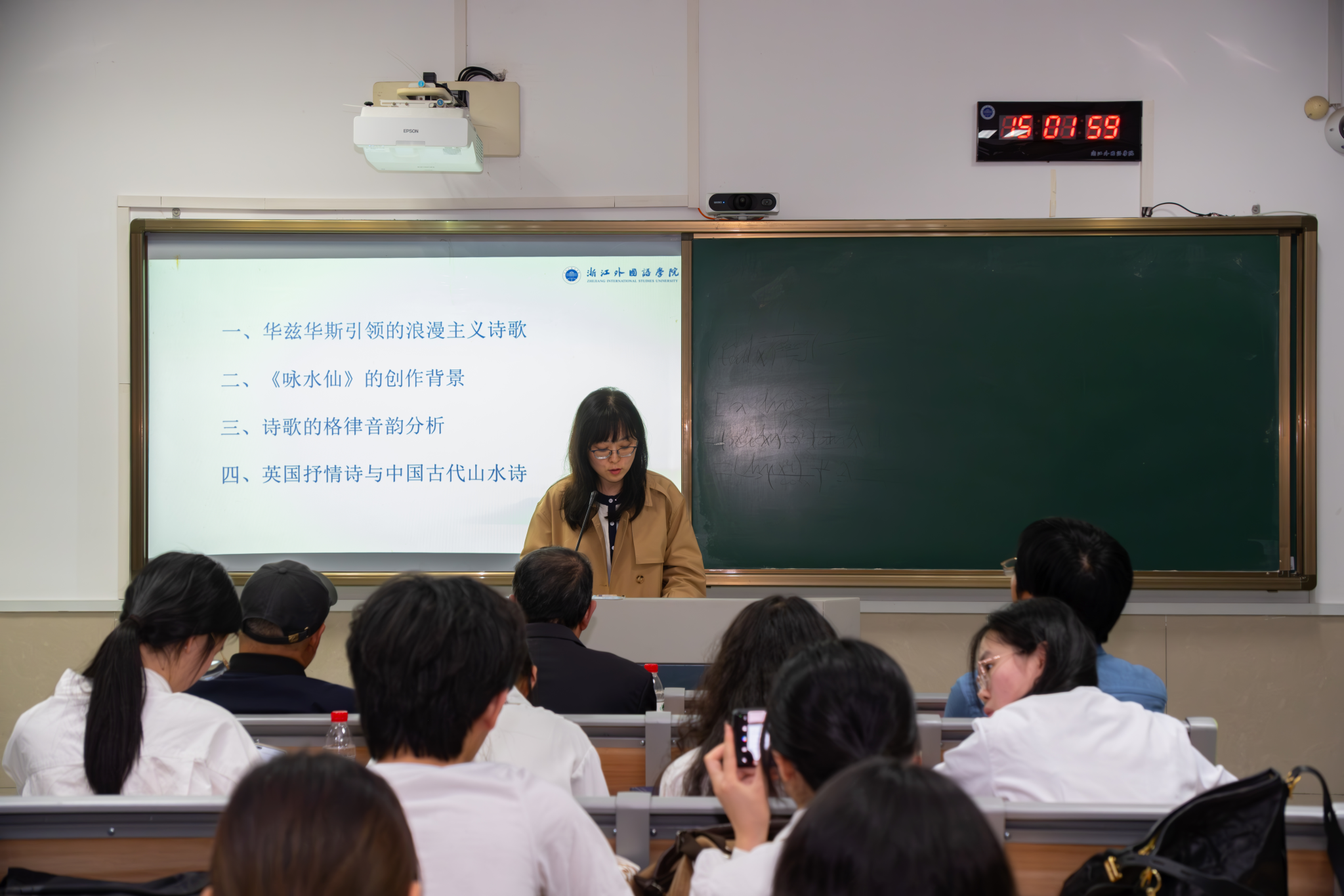英语语言文化学院刘莹副教授结合学生朗诵的英国著名诗歌“I Wandered Lonely as a Cloud”,讲授《从华兹华斯看英国浪漫主义诗歌》,深入阐释《咏水仙》的创作背景、诗歌的格律音韵分析、英国抒情诗与中国古代山水诗的关联等。