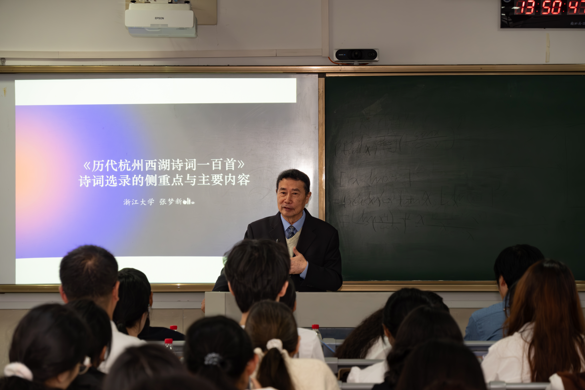 浙江大学人文学院原党委书记张梦新教授围绕亚运会礼品书《历代杭州西湖诗词一百首》,讲授历代名家吟咏西湖的如同璀璨的群星、熠熠生辉的诗作,分析诗歌相关的杭州风情民俗、阐释志士豪杰爱国爱民情怀,深情表达对杭州这座城市的热爱和自豪。