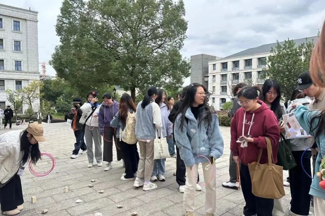 在套圈区域,摆满了琳琅满目的奖品:可爱的毛绒玩具、解压神器小饰品、充气卡通手环等吸引了同学们的目光。每位获得套圈机会的同学都充满斗志,他们仔细瞄准、沉稳出手,试图用精准的投掷赢得心仪的奖品。