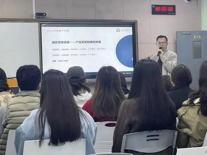 2024年11月19日,“文旅菁英荟·梦启航”第4期活动暨高管面对面第2期于望D315开展。此次活动特别邀请了嗨Kids国际营地创始人李永刚及高管团队亲临现场,与文旅学子们进行了面对面的交流与分享。他们详细介绍了国际营地的运营模式、发展前景以及管培生培养项目的具体内容。从营地管家到研学课程导师,从英语翻译到学生心理观测与疏导,每一个岗位都承载着对未来人才的期待与培养。
