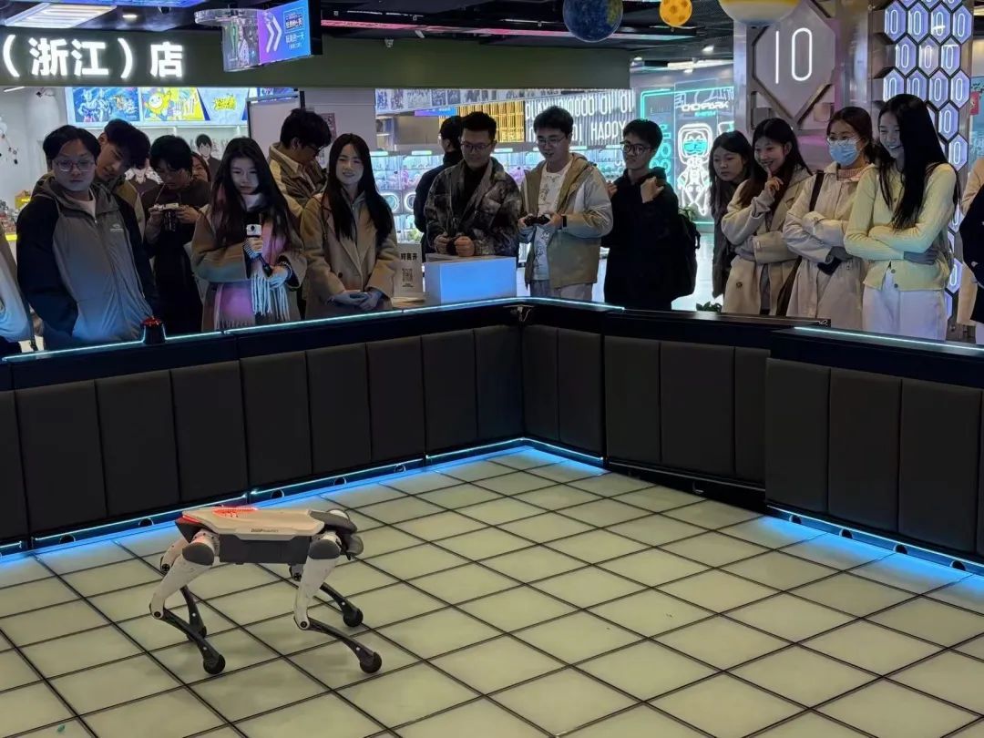 在“绝影出击”区域,机器狗的自如动作引得同学们惊叹不已,几位同学还在讲解员的引导下亲自上手操纵,与全球首创的AI机器狗进行了亲密互动。