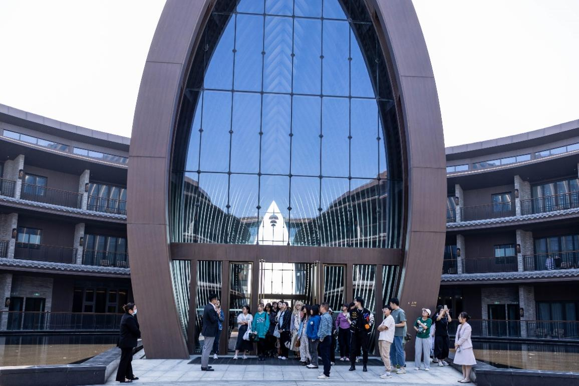 接下来由酒店工作人员带领同学们参观悦柳酒店。该酒店以旖旎的自然环境为依托,专为宾客打造自然休闲、返璞归真的栖息之所。同时酒店配备了规模与格调并具的国际会议宴会厅,对标世界乡村旅游会议的规格,让同学们看见了世界乡村旅游小镇的未来美好。