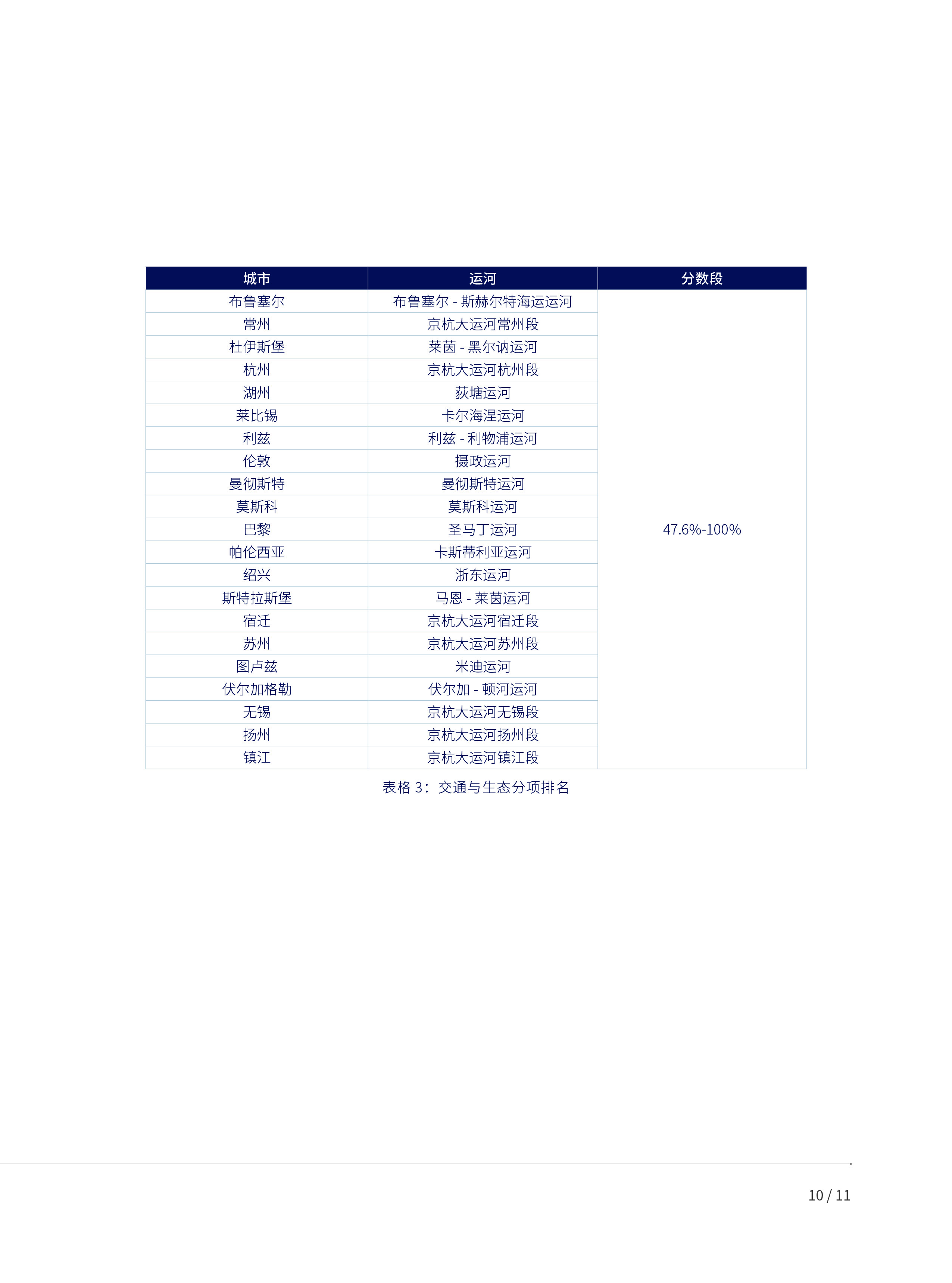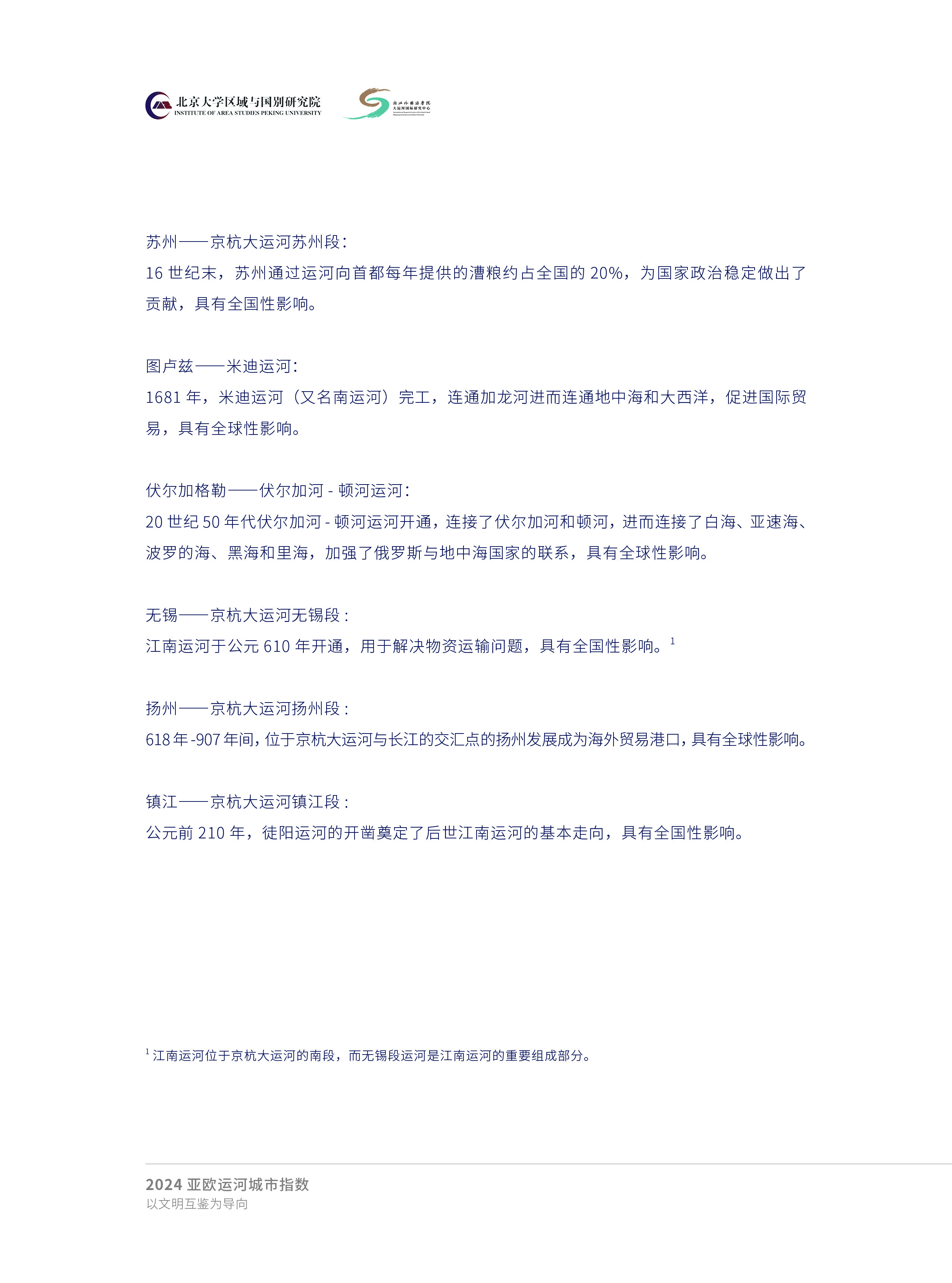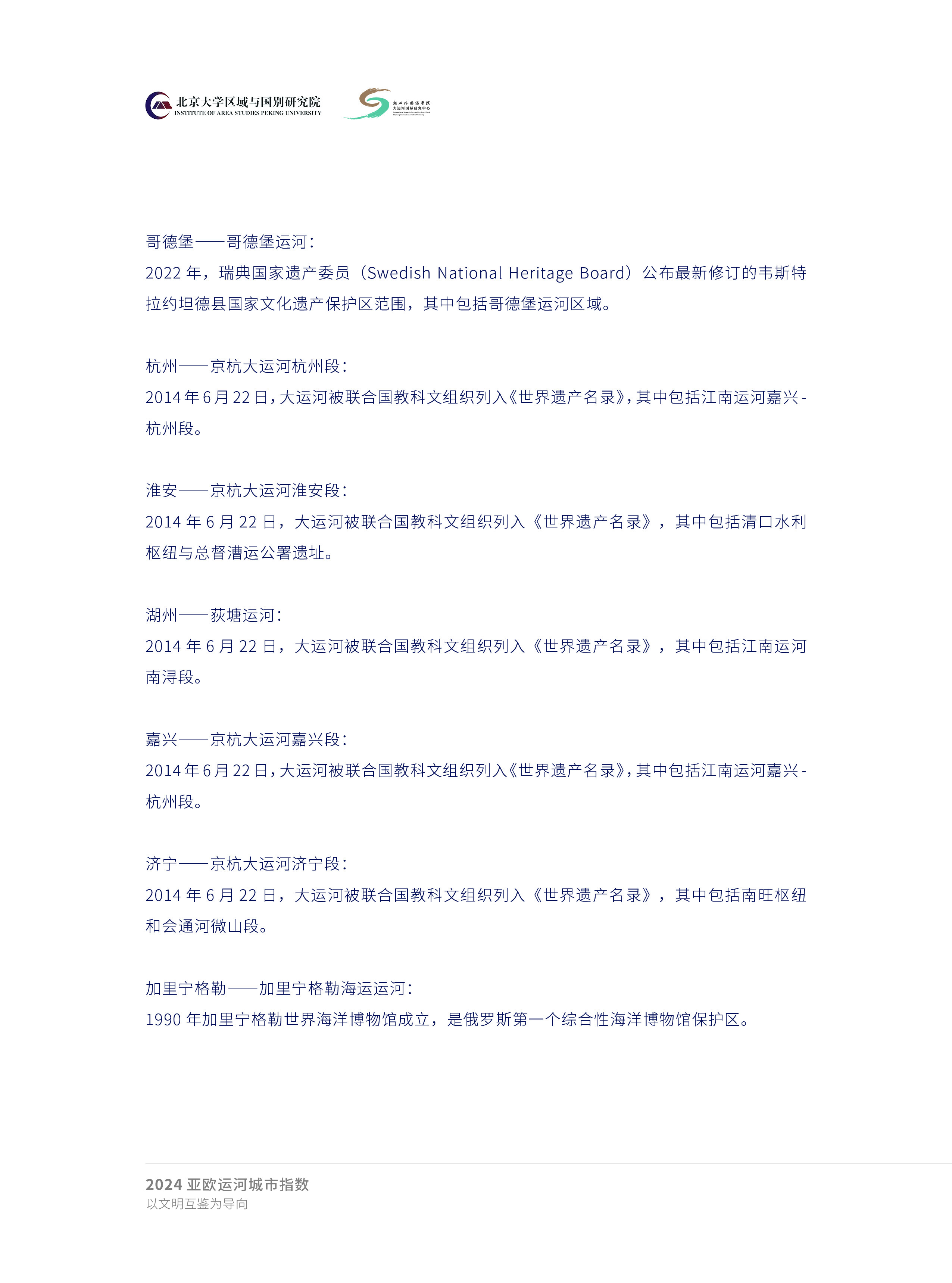本报告以“尊重各文明成果,以评价促进文明交流互鉴”为指引,基于运河城市重大历史事件、文旅资源、交通和环境等多元对象,构建包括文化旅游、地理区位和生态环境在内的多学科全球运河城市评估体系,并对42个亚欧运河城市展开评估。评估结果显示,淮安、嘉兴、无锡、扬州、杭州、绍兴、苏州等中国浙江和江苏沿线运河城市表现突出。这与它们兴盛至今的货运航行、文旅产业密切相关。在生态维度上,欧洲运河城市整体领先,呈现出“各美其美、美美与共”的全球多样性格局。