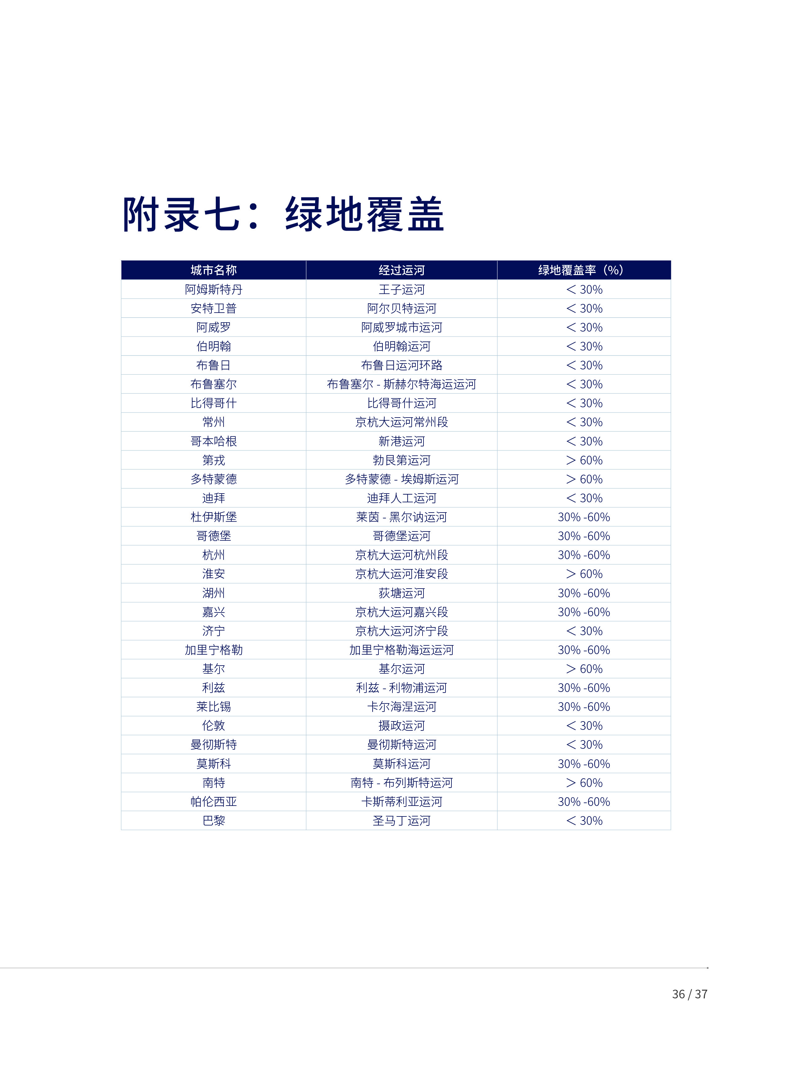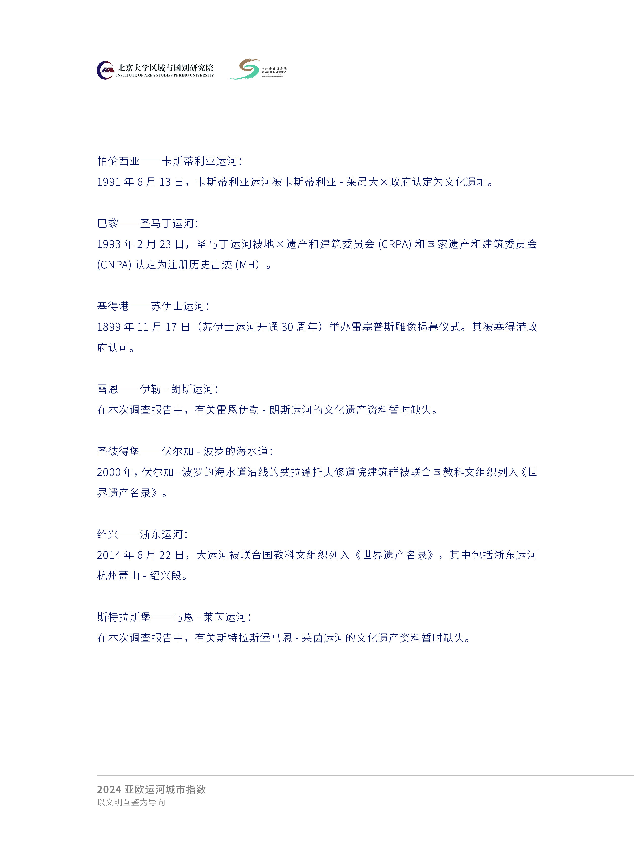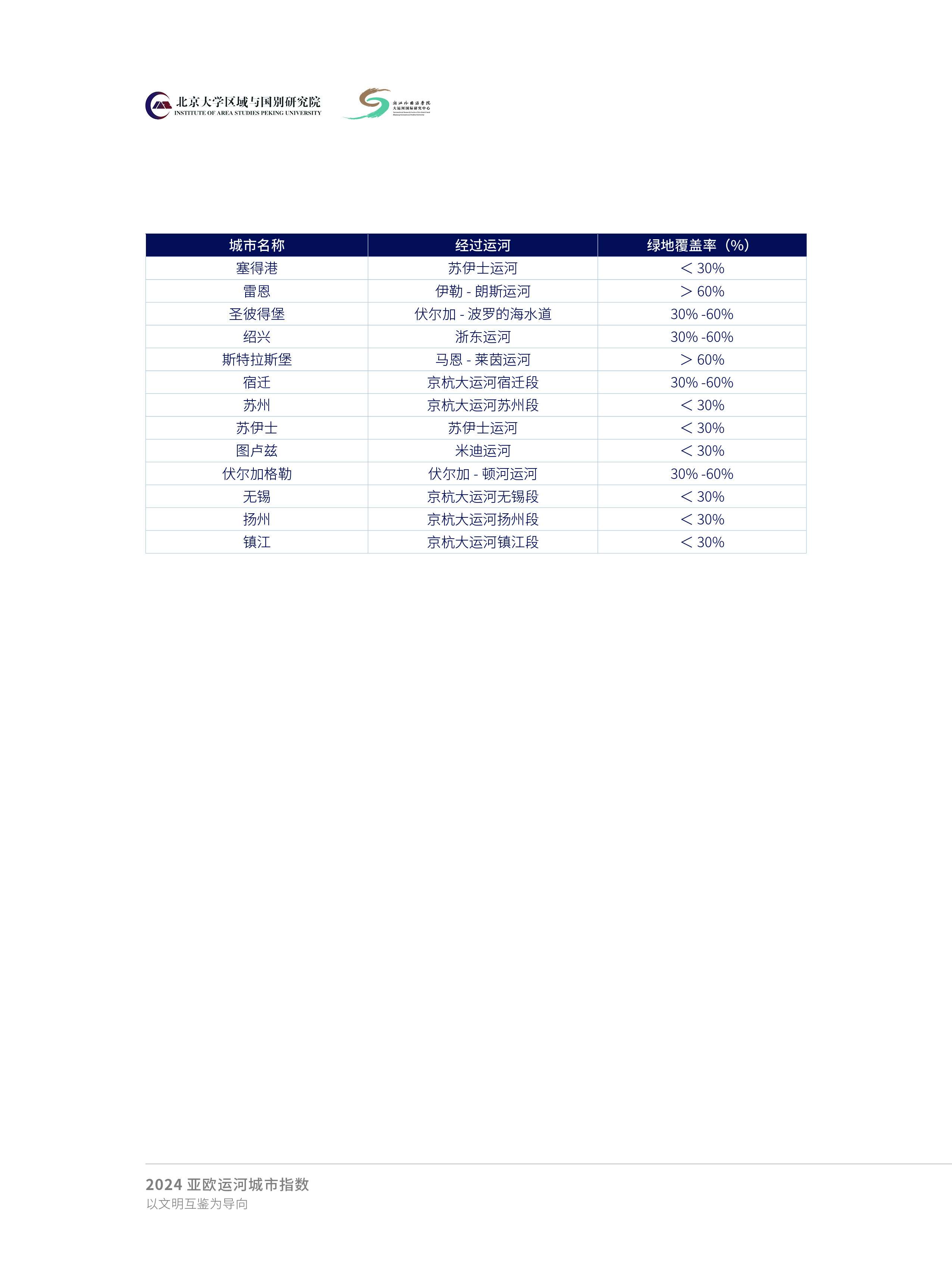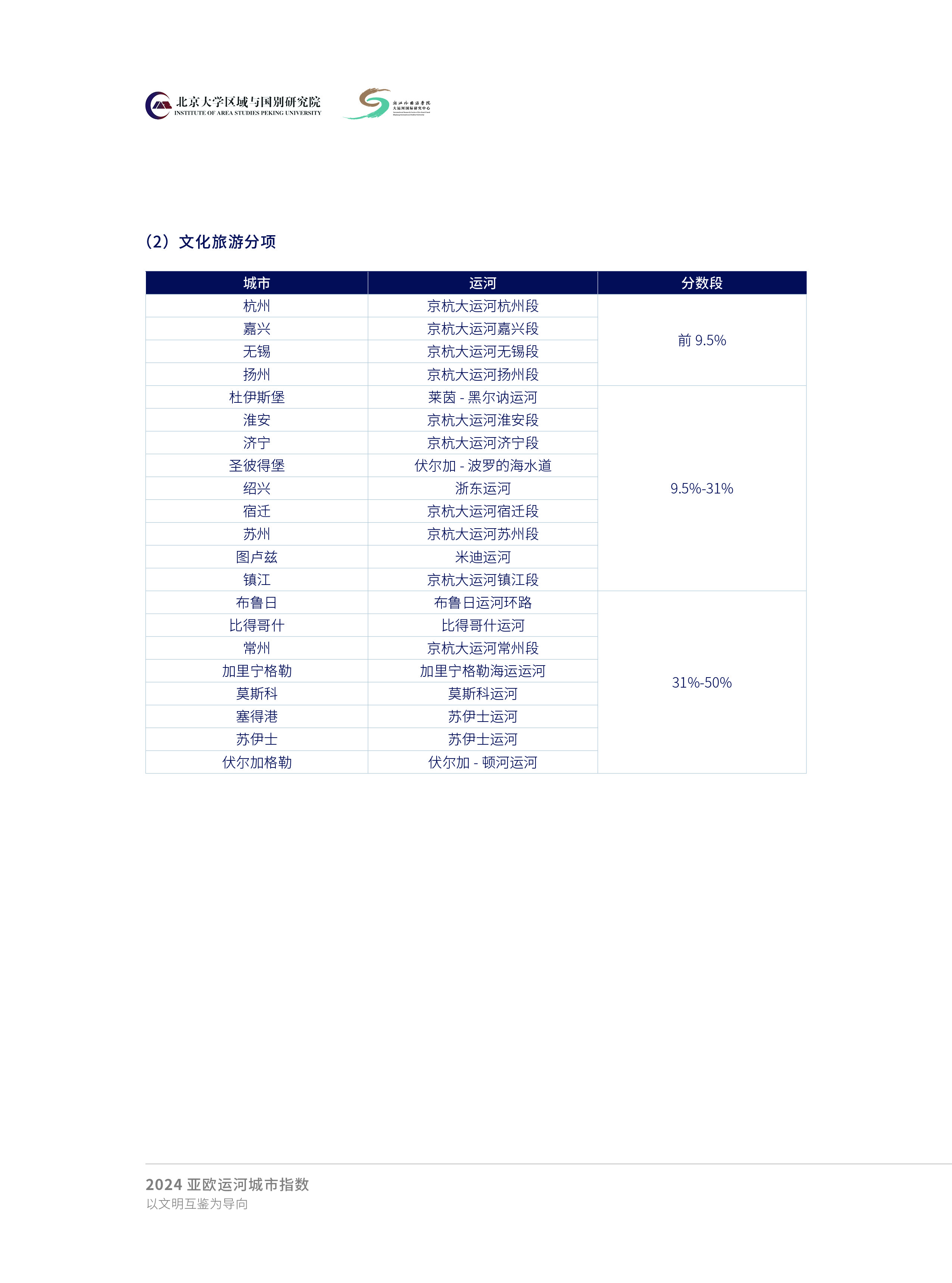 本报告以“尊重各文明成果,以评价促进文明交流互鉴”为指引,基于运河城市重大历史事件、文旅资源、交通和环境等多元对象,构建包括文化旅游、地理区位和生态环境在内的多学科全球运河城市评估体系,并对42个亚欧运河城市展开评估。评估结果显示,淮安、嘉兴、无锡、扬州、杭州、绍兴、苏州等中国浙江和江苏沿线运河城市表现突出。这与它们兴盛至今的货运航行、文旅产业密切相关。在生态维度上,欧洲运河城市整体领先,呈现出“各美其美、美美与共”的全球多样性格局。