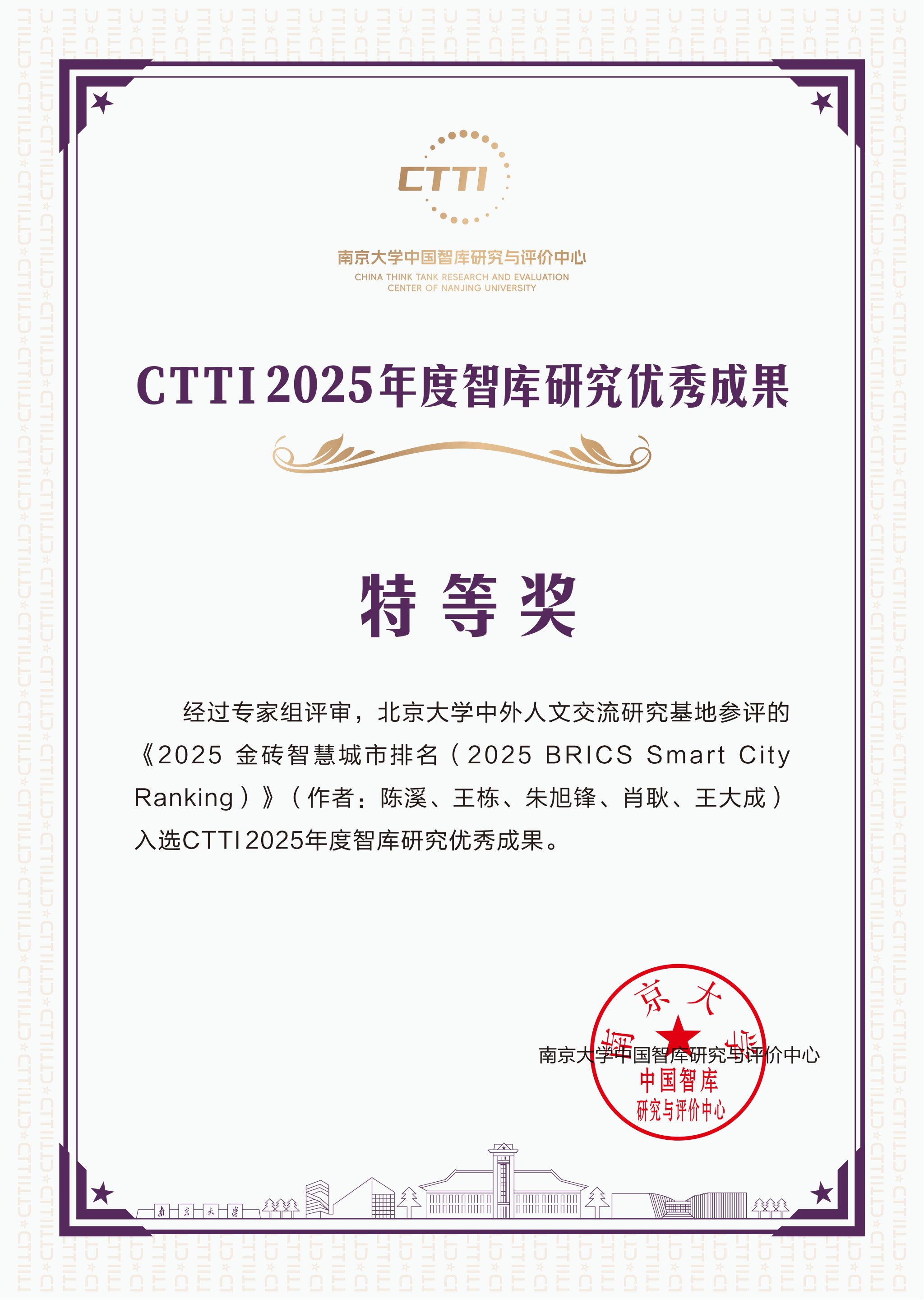 此外,陈溪教授还牵头完成了《2025金砖智慧城市排名》和《2025全球太空基础设施评估》报告,并与北京大学、清华大学、香港中文大学(深圳)、中国科学院相关机构联合发布,上述成果在本次“2025新型智库治理论坛”分获优秀成果特等奖(2023、2024年也蝉联特等奖)和一等奖。