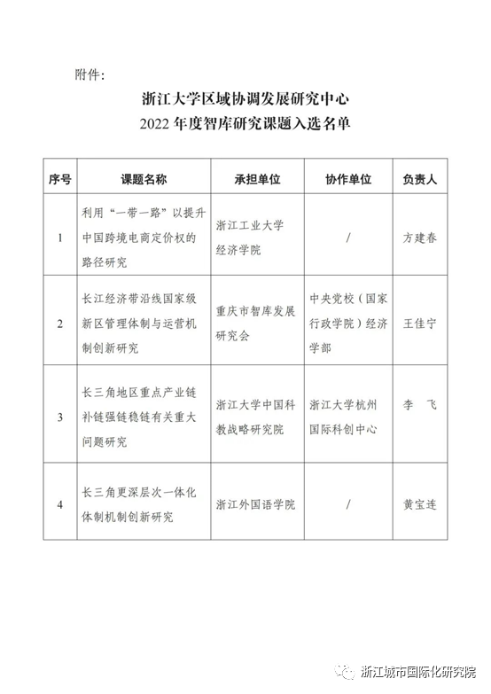 近日,根据浙江大学区域协调发展研究中心网站公布信息,经专家严格评审,确定了中心2022年课题的承担单位及负责人,并向社会公布,现已过公示日期。我校浙江城市国际化研究院申报的课题《长三角更深层次一体化体制机制创新研究》成功入选。