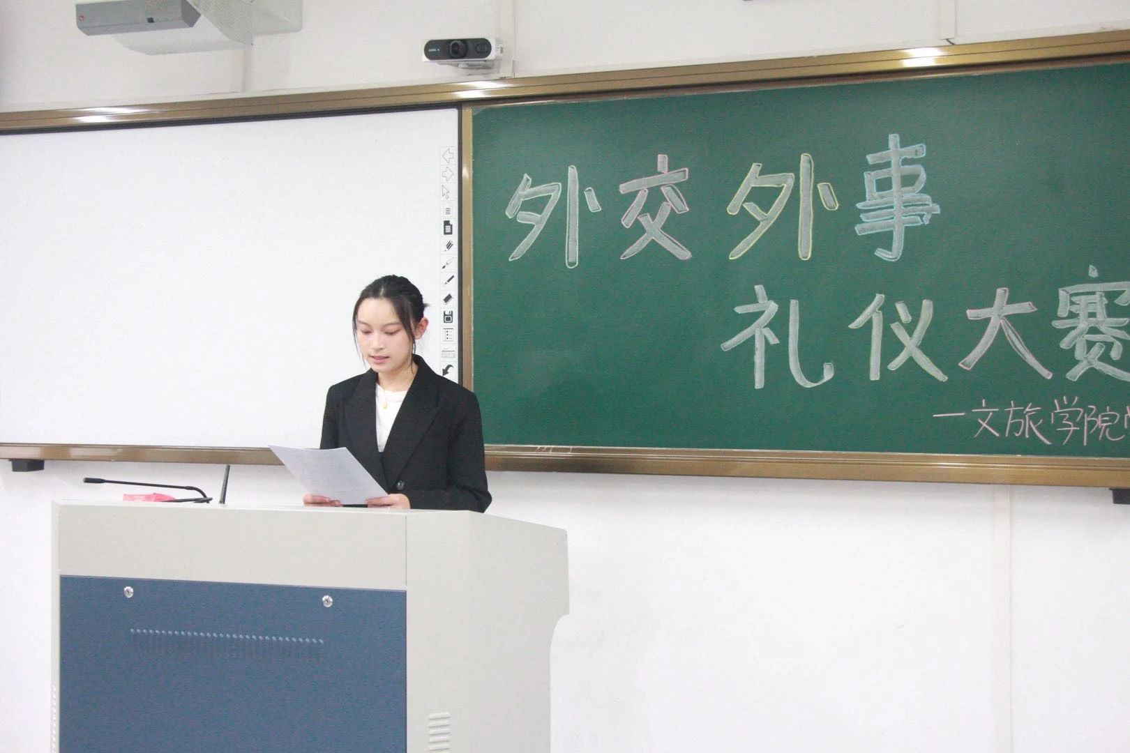 4日10日,文旅学院外交外事礼仪大赛在融B110举行。本届赛事采用 “理论笔试+实战面试”双阶考核模式,首轮笔试筛选出国际关系、文旅政策等领域的60道高频考点,涵盖“美国对等关税政策溯源”“中欧经贸协定绿色条款”等热点理论辨析。