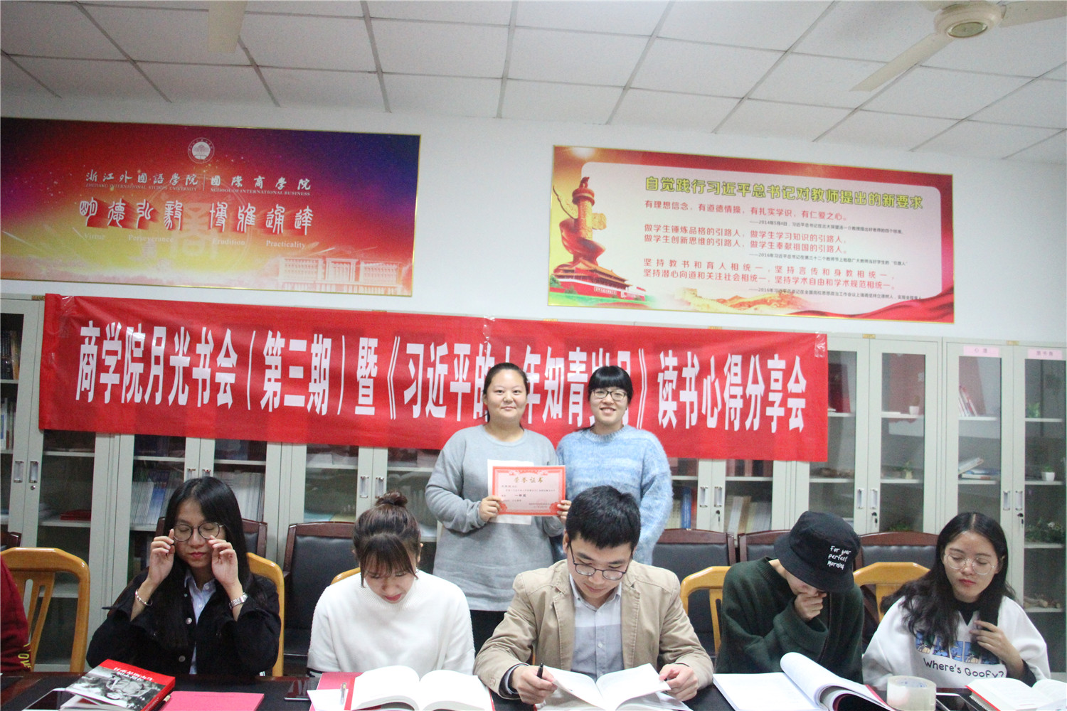 10月29日晚,商学院月光书会(第三期)暨《习近平的七年知青岁月》读书心得分享会于望院D428教室举行。学生新闻中心指导老师王化明、学生新闻中心主任陈雪珂及日前学院举办的音频征集比赛获奖同学出席会议,本次会议由院学生新闻中心办公室部长刘玉主持,在座同学谈心得、说体会、话担当,总结学习感悟。