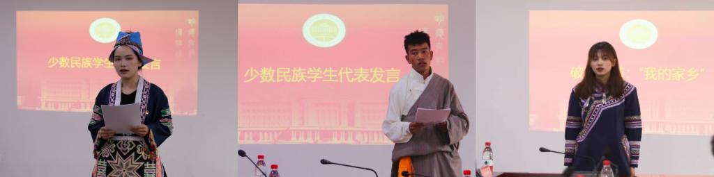 文旅学院苗族学生王喜盖,藏族学生旦增桑珠,壮族学生付香玲、李柔,布依族学生罗思思、罗芷兰等分别发言,分享了大学生活的感悟,从“文化和旅游”角度,介绍了各自家乡的文化特色,并纷纷表示要维护民族团结,努力学习,将来建设好祖国和家乡。