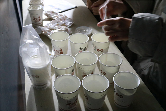 志愿者们提前悉心准备了热腾腾的豆浆,小面包以及精心制作的卡片。服务过程中,志愿者还和叔叔阿姨们进行了简单的交流。