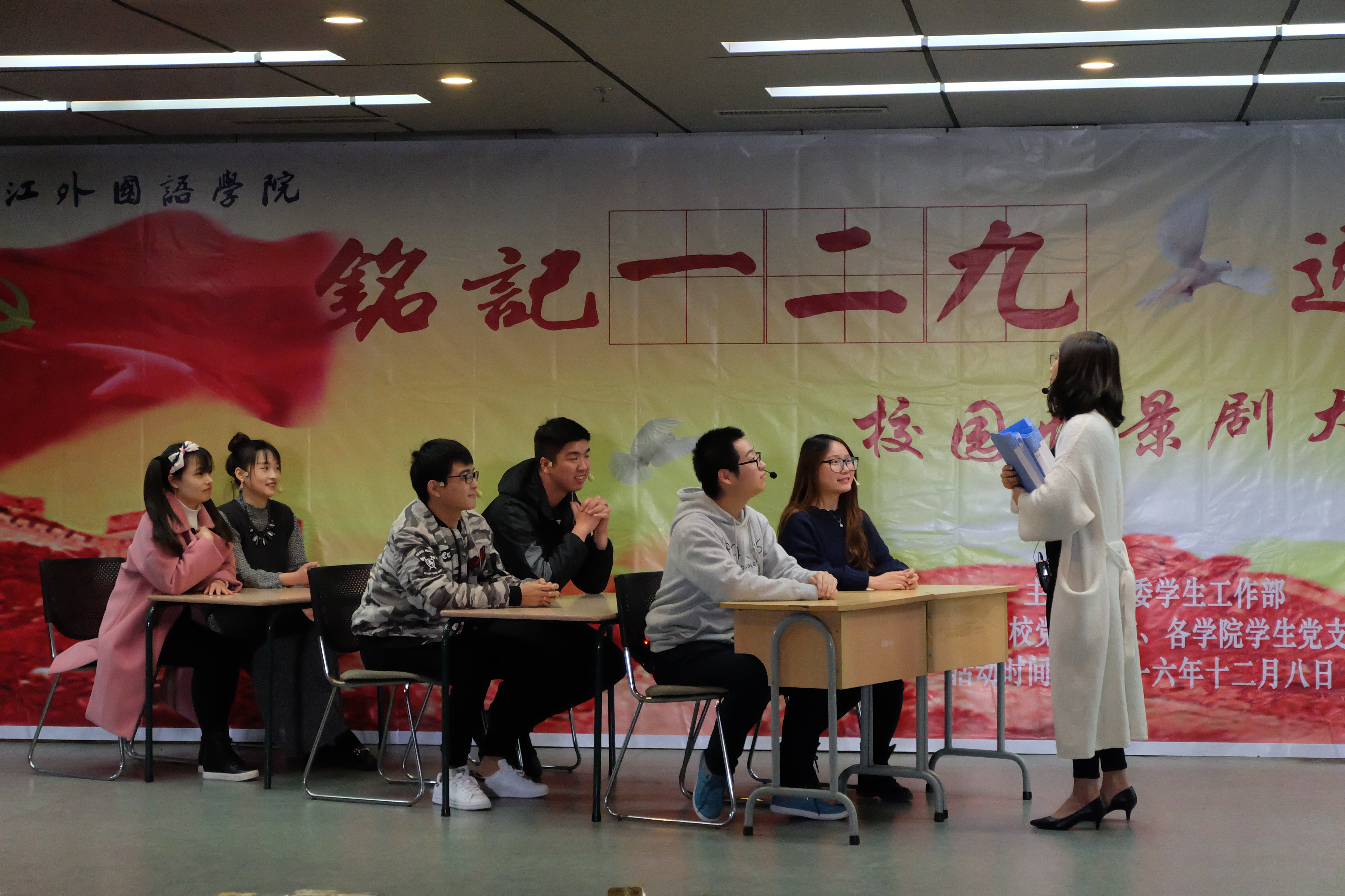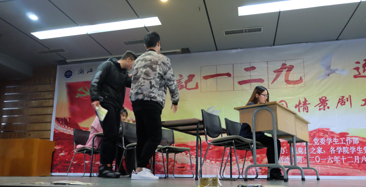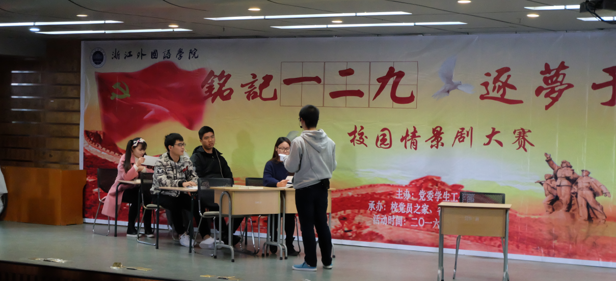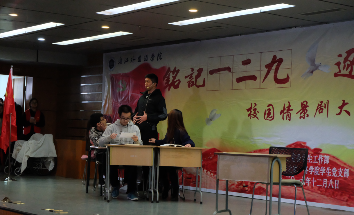 为了纪念“一二·九”运动81周年,并借此契机激发广大学生的爱国热情,弘扬和培育民族精神,进一步活跃校园文化生活,培养学生健康的审美情趣,我校学生处、党员之家于12月8日在博文堂二楼组织开展了 “铭记一二九 逐梦于浙外”校园情景剧比赛。