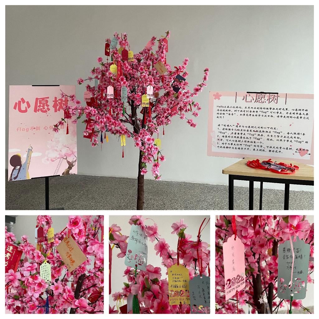 桃之夭夭,灼灼其华。“我们的目的就是给学生做一件有意义的‘小事’。”辅导员计玲盈说,“学生需要对2021有一个回顾,也需要对2022立个flag。”在学院一楼门口,心愿树上挂满了同学们的心愿卡片。除了这些朴实的愿望外,同学们更多的表达了一种朝气蓬勃的情怀和对2022年的憧憬。