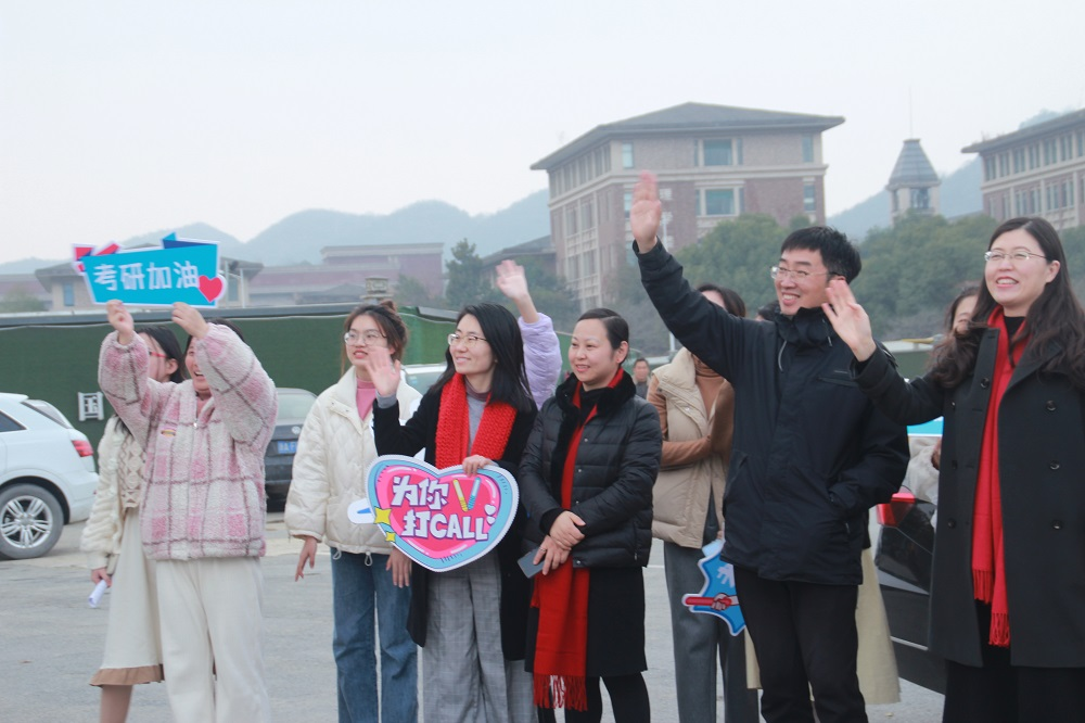 的校门口,学院执行院长张健康,党总支书记范芸芸,副院长贾新明和党总支副书记陈超带领党员学生和团学干部手挥“学长学姐加油”“一‘研’为定 文旅有你”等祝福标识牌齐声为学院考研学子祝福送行。
