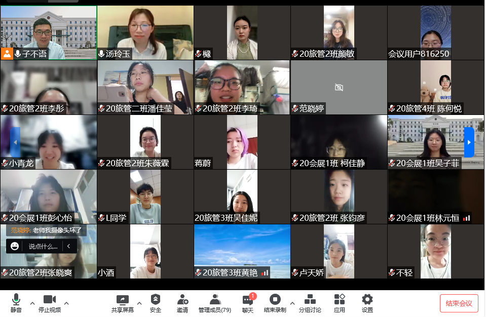 5月19日是中国旅游日,学院举办了《未来已来:文旅业展望和文旅新业态》线上分享会,这也是学院“诗和远方·成长系列讲座”之一。讲座邀请了游侠客国际旅行社华东区总监、校友林小彬女士,和中旅集团高级导游、校友汤玲玉女士担任主讲。学院20级、21级学生以及部分老师参加了讲座。讲座由学院党总支书记范芸芸主持。