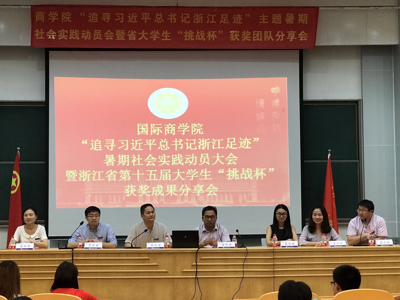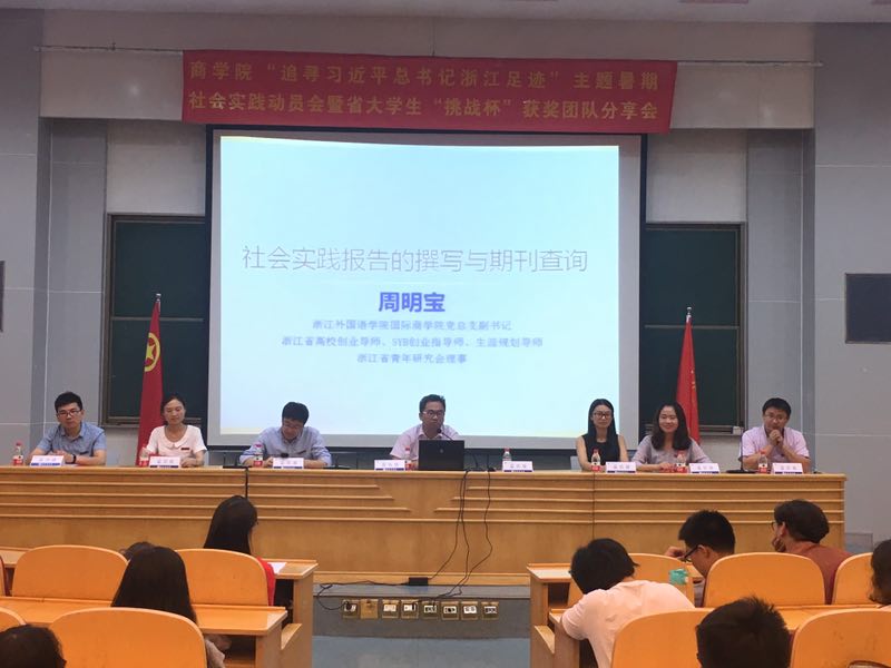 6月7日晚六点,商学院“追寻习近平总书记浙江足迹”主题暑期社会实践动员会暨省大学生“挑战杯”获奖团队分享会在望院C116召开。院党总支副书记周明宝、会展系教授张跃西及学院全体辅导员出席了动员会,大会由团委副书记周长喜主持;14、15、16级各班团支书、暑期社会实践团队申报代表和团学组织骨干参加大会。