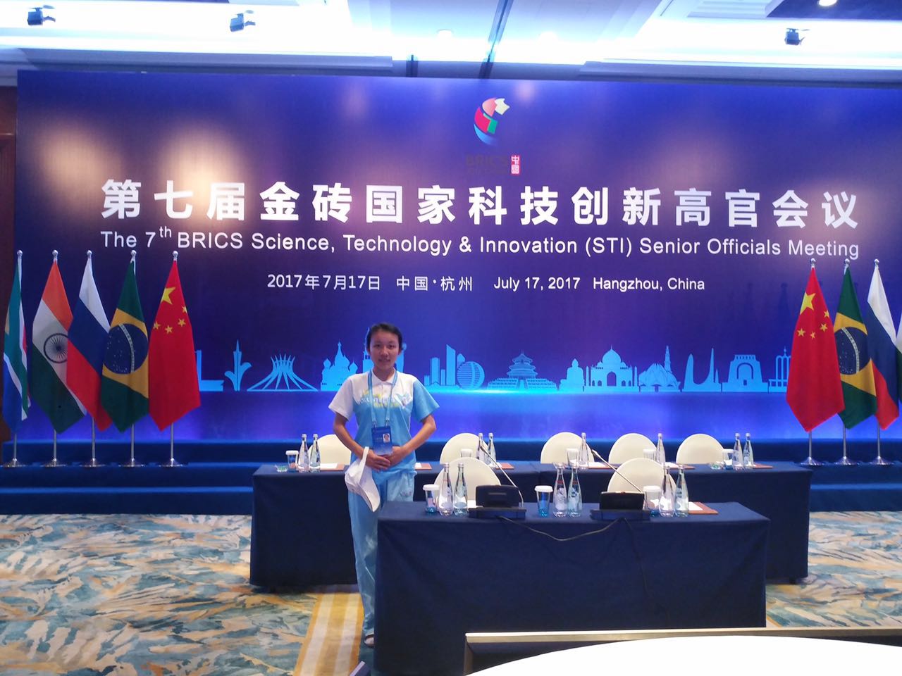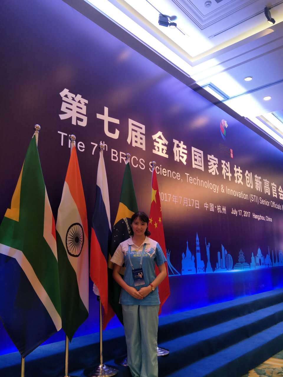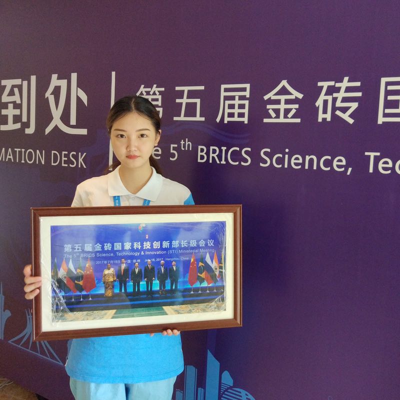 这次能作为金砖五国科技创新部长级会议的志愿者,很荣幸,也是很宝贵的记忆。在炎炎夏日来到杭州,一个星期里,从培训到上岗,不管是知识还是精神,我都收获颇多。我此次负责的是会议的签到处的工作,每天会有国内外的参会人员在我们这里报道或咨询,让我深刻体会到了礼仪和外语能力的重要性。其实我们志愿者的工作,就像路边的行道树,虽然单调,但只要能为路人带去一片清凉,就很有意义了。