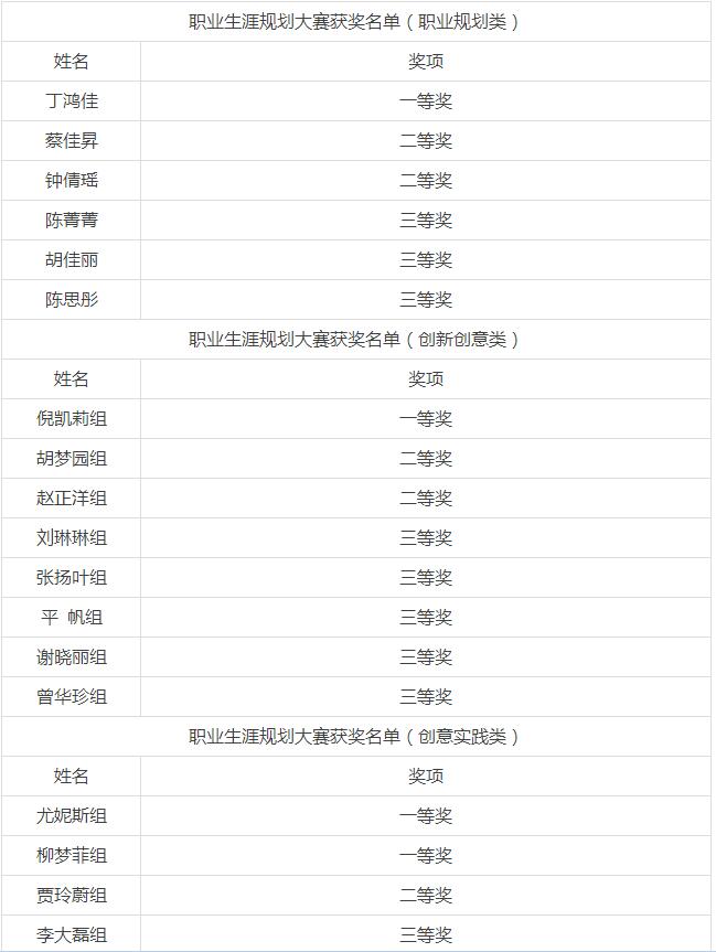 台湾三级片 学生丁鸿佳获职业规划类一等奖。倪凯莉、陈园、郑兰兰、沈焕聪小组获创新创意类一等奖。尤尼斯和胡柔小组及柳梦菲同学获创业实践组一等奖。台湾三级片 获奖人数全校第一。同时,学院荣获优秀组织奖,周明宝、梁汲媛和周长喜获得优秀指导教师奖。