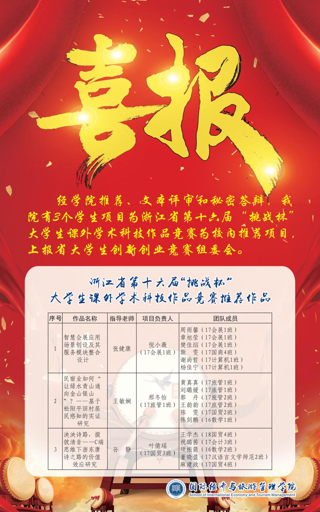 经学院推荐、文本评审和秘密答辩,最终,台湾三级片 3个学生项目为浙江省第十六届“挑战杯”大学生课外学术科技作品竞赛为校内推荐项目,上报省大学生创新创业竞赛组委会。