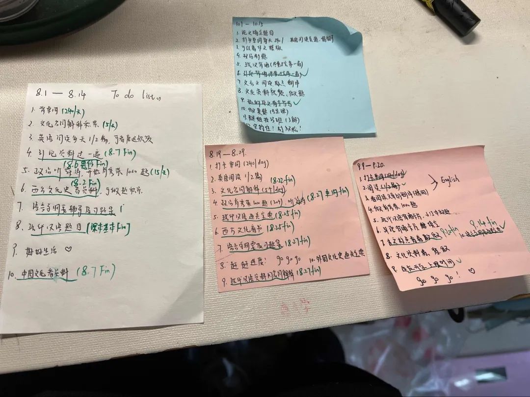 2022考研人数多达457万人,较2021年增长80万人,可谓是千军万马过独木桥。在百万人中脱颖而出,金溪有一套自己的学习秘诀。她认为时间的管理尤为重要,“做事没计划,盲人骑害马”。在备考过程中,她把任务分解开,把时间精细化,细化到每周,每天要做些什么,她会写下to do list,完成一个划掉一个。这样的模式使她在清楚了解进程的同时提升成就感,增加自信心。金溪说:“善于利用时间的人,永远找得到充裕的时间。备考的时候,可能会有论文、实习等别的各种事情要学会管理规划时间,利用时间是一个极其高级的规律”考研也是一场没有硝烟的心理战,“慢慢来”的态度使金溪在备考过程中更细心、更投入。