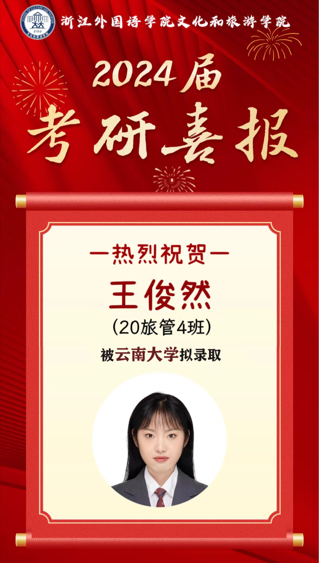 2024届文旅升学喜报⑭ | 20旅管4班王俊然成功考取云南大学人文地理学专业硕士研究生