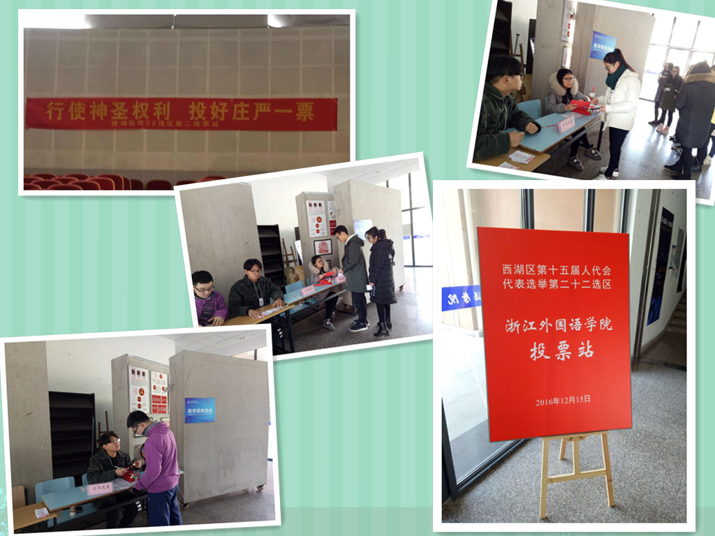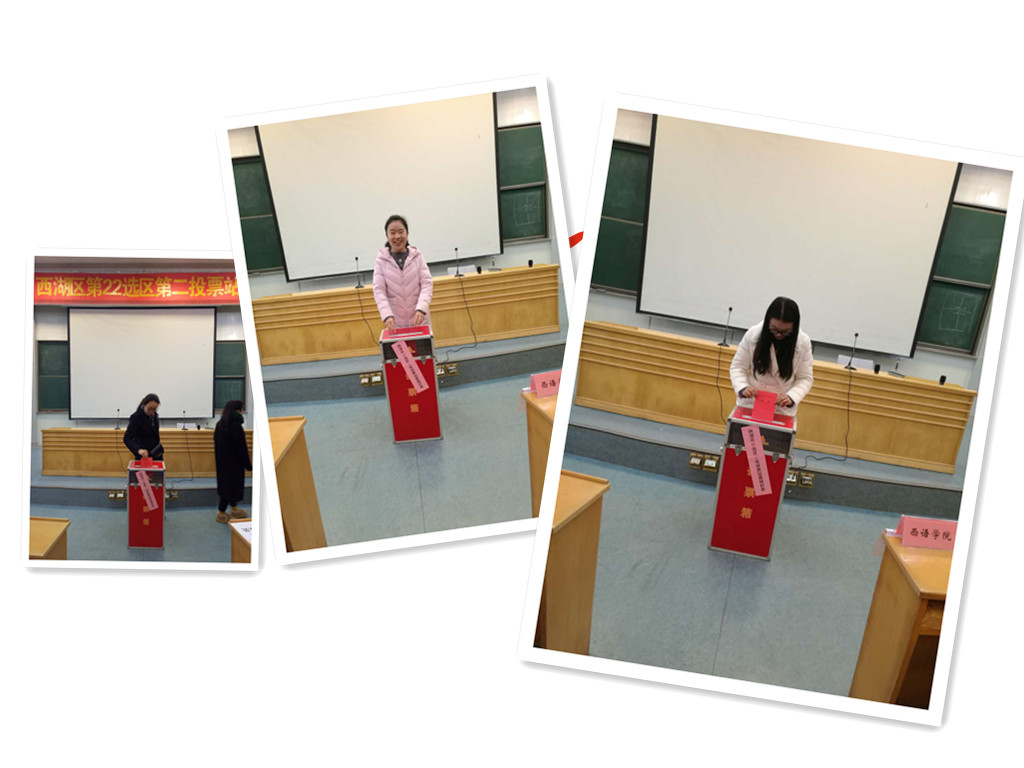 上午10点半,2015级营销1班褚高建在西湖区第22选区第三投票站兴奋地投下自己的选票:“今天,我第一次拿到自己的选民证,参加了西湖区人大代表的换届选举。可以参与人大代表的选举,我感到十分荣幸。大家都井然有序地进行了投票,整个过程非常庄严和有序。正因为“人民代表人民选,选好代表为人民”,所以参与人大代表的选举投票是一件神圣的事情,只有把票投给人民信任的候选人,才算真正行使好这项权利。”除了自己投票,身为班长的褚高建还要组织本班级的同学有序进行投票,整个过程很顺利,前后10分钟,全班30余人全部投出了自己宝贵的一票。