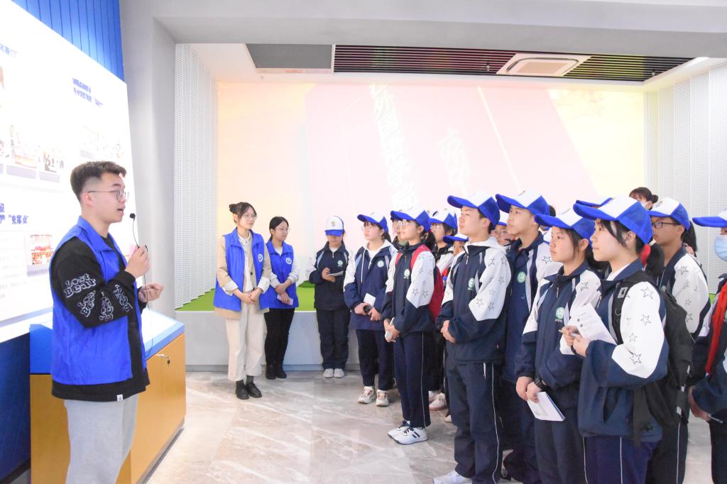 从静思湖到校训石再到校史馆,到访中小学生在学院志愿者带领和讲解下感受浙外的校园文化魅力和历史底蕴。当参观到校史馆“党建思政”模块的展区前时,学院学生党员许哲为大家开讲了一堂党课,他带领大家回顾了百年党史中的重要历史大事件,并通过讲述青年时期习近平在农村插队时求知若渴、与书为伴、一步步积累成长的故事号召大家学习青年习近平矢志不渝的理想信念、爱国为民的家国情怀、勤奋好学的进取精神和吃苦耐劳的优秀品格。当问及大家的梦想是什么,一位女孩坚定的说出此时此刻自己想要考上理想的大学,并会像青年习近平那般努力学习。