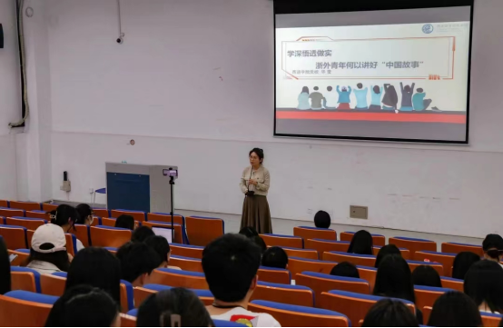 毕莹书记以《学深悟透做实,浙外青年何以讲好“中国故事”》为题,从跨文化沟通说起,介绍了沟通的“55387理论”,指出:决定沟通效能的55%体现在沟通的态度,包括动作、表情等;38%是讲话时的语气、语调、肢体语言等;最后的7%才是说话的内容。她强调:浙外青年在讲“中国故事”时已经具备了多语种优势,未来还需要进一步加深对中国文化的理解,掌握更多的跨文化沟通技巧。毕莹老师的党课幽默风趣、深入浅出,与同学们深入互动,启发同学们思考。