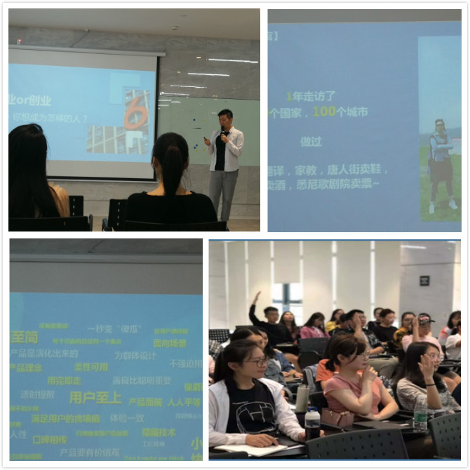 讲师说了他大学本科毕业以后像传奇一样的人生经历:本科毕业后不考公务员、不考研,做了一名“生活体验官”,游历10国100城,因为缺钱在悉尼歌剧院卖过票,在唐人街卖过鞋,几乎什么都做过,也尝到了人间百态,一年后在父母的催促下回国做了一家银行的理财顾问。但…一年后他辞职了,因为他觉得自己并不真正想做这个。然后去港大进修,又在华为、IBM、腾讯三家公司的offer中选择了腾讯,几年后又选择了创业,于是有了今天的易赋。