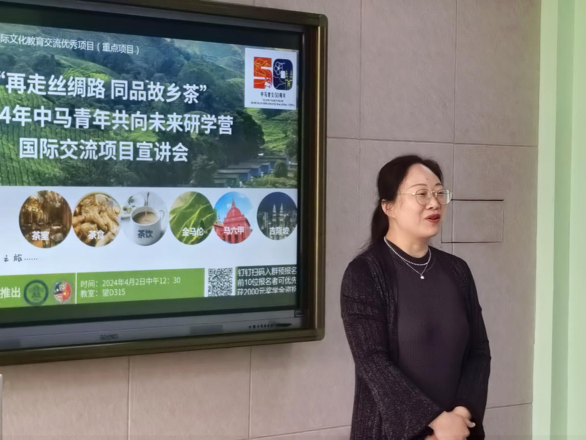 4月2日,“再走丝绸路,同品故乡茶”2024年中马青年共向未来研学营首期宣讲会在望D315举行。本次宣讲会由项目负责人文旅学院李娜老师主持,学院党总支副书记黄瑾、院长助理王敏娴、办公室教师郝韵共同参会,来自文旅学院、东语学院等多个学院的近20位同学参加了本次宣讲会。
